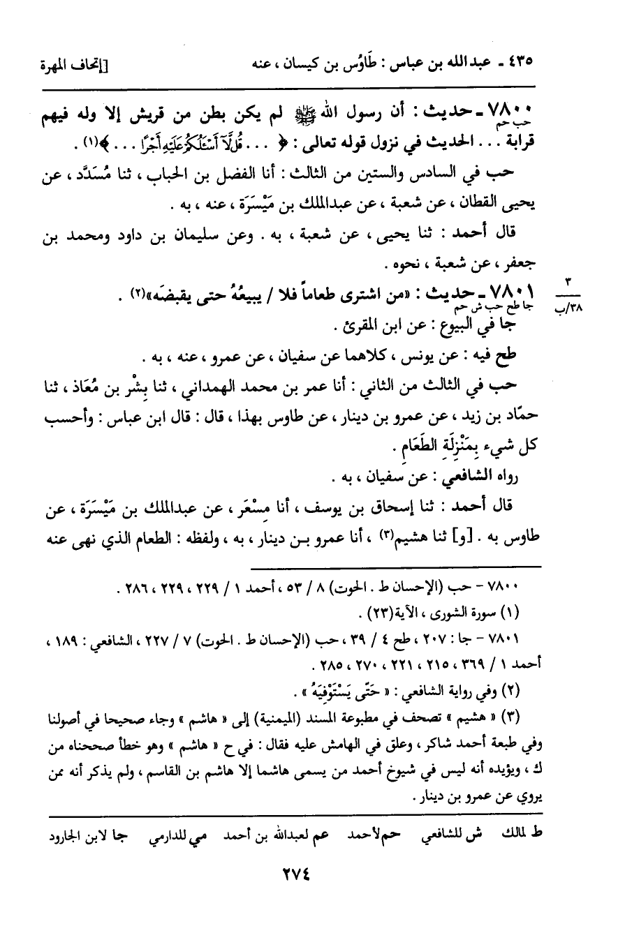 طح فِيهِ: عَنْ يُونُسَ، كِلاهُمَا عَنْ سُفْيَانَ، عَنْ عَمْرٍو، عَنْهُ، بِهِ. حب فِي الثَّالِثِ مِنَ الثَّانِي: أنا عُمَرُ بْنُ مُحَمَّدٍ الْهَمْدَانِيُّ، ثنا بِشْرُ بْنُ مُعَاذٍ، ثنا حَمَّادُ بْنُ زَيْدٍ، عَنْ عَمْرِو بْنِ دِينَارٍ، عَنْ طَاوُسٍ، قَالَ: قَالَ ابْنُ عَبَّاسٍ: وَأَحْسَبُ كُلَّ شَيْءٍ بِمَنْزِلَةِ الطَّعَامِ. رَوَاهُ الشَّافِعِيُّ: عَنْ سُفْيَانَ، بِهِ. قَالَ أَحْمَدُ: ثنا إِسْحَاقُ بْنُ يُوسُفَ، أنا مِسْعَرٌ، عَنْ عَبْدِ الْمَلِكِ بْنِ مَيْسَرَةَ، عَنْ طَاوُسٍ، وثنا هُشَيْمٌ، أنا عَمْرُو بْنُ دِينَارٍ، بِهِ. وَلَفْظُهُ: الطَّعَامُ الَّذِي نَهَى عَنْهُ