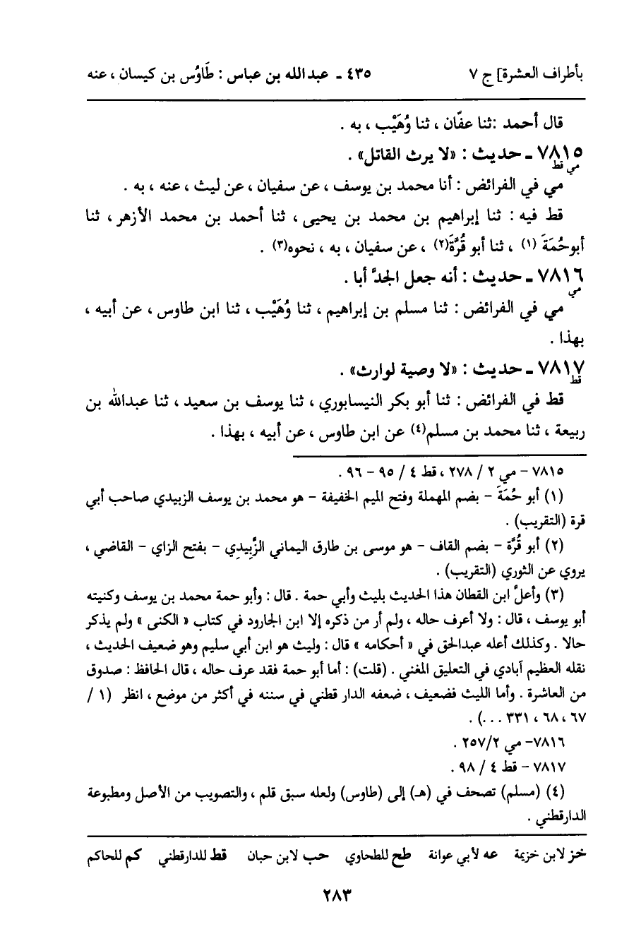 7817 - حَدِيثٌ (قط) : " لا وَصِيَّةَ لِوَارِثٍ ". قط فِي الْفَرَائِضِ: ثنا أَبُو بَكْرٍ النَّيْسَابُورِيُّ، ثنا يُوسُفُ بْنُ سَعِيدٍ، ثنا عَبْدُ اللَّهِ بْنُ رَبِيعَةَ، ثنا مُحَمَّدُ بْنُ مُسْلِمٍ، عَنِ ابْنِ طَاوُسٍ، عَنْ أَبِيهِ، بِهَذَا.