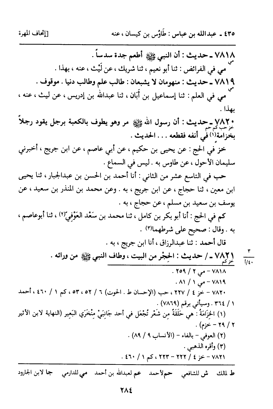 7820 - حَدِيثٌ (خز حب كم حم) : أَنَّ رَسُولَ اللَّهِ صَلَّى اللَّهُ عَلَيْهِ وَسَلَّمَ، مَرَّ وَهُوَ يَطُوفُ بِالْكَعْبَةِ بِرَجُلٍ يَقُودُ رَجُلا بِخِزَامَةٍ فِي أَنْفِهِ فَقَطَعَهُ. . الْحَدِيثَ. خز فِي الْحَجِّ: عَنْ يَحْيَى بْنِ حَكِيمٍ، عَنْ أَبِي عَاصِمٍ، عَنِ ابْنِ جُرَيْجٍ، أَخْبَرَنِي سُلَيْمَانُ الأَحْوَلُ، عَنْ طَاوُسٍ، بِهِ. لَيْسَ فِي السَّمَاعِ. حب فِي التَّاسِعَ عَشَرَ مِنَ الثَّانِي: أنا أَحْمَدُ بْنُ الْحَسَنِ بْنِ عَبْدِ الْجَبَّارِ، ثنا يَحْيَى بْنُ مَعِينٍ، ثنا حَجَّاجٌ، عَنِ ابْنِ جُرَيْجٍ، بِهِ. وَعَنْ مُحَمَّدِ بْنِ الْمُنْذِرِ بْنِ سَعِيدٍ، عَنْ يُوسُفَ بْنِ سَعِيدِ بْنِ مُسْلِمٍ، عَنْ حَجَّاجٍ، بِهِ. كم فِي الْحَجِّ: أنا أَبُو بَكْرِ بْنُ كَامِلٍ، ثنا مُحَمَّدُ بْنُ سَعْدٍ الْعَوْفِيُّ، ثنا أَبُو عَاصِمٍ، بِهِ. وَقَالَ: صَحِيحٌ عَلَى شَرْطِهِمَا. قَالَ أَحْمَدُ: ثنا عَبْدُ الرَّزَّاقِ، أنا ابْنُ جُرَيْجٍ، بِهِ.