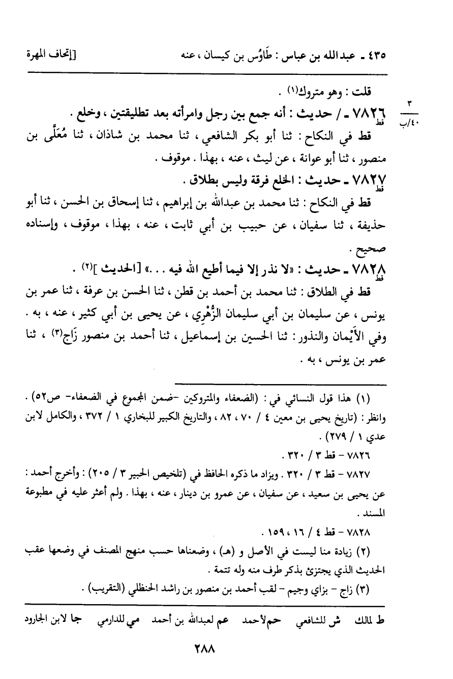 7827 - حَدِيثٌ (قط) : الْخُلْعُ فُرْقَةٌ وَلَيْسَ بِطَلاقٍ. قط فِي النِّكَاحِ: ثنا مُحَمَّدُ بْنُ عَبْدِ اللَّهِ بْنِ إِبْرَاهِيمَ، ثنا إِسْحَاقُ بْنُ الْحَسَنِ، ثنا أَبُو حُذَيْفَةَ، ثنا سُفْيَانُ، عَنْ حَبِيبِ بْنِ أَبِي ثَابِتٍ، عَنْهُ، بِهَذَا، مَوْقُوفٌ، وَإِسْنَادُهُ صَحِيحٌ.
