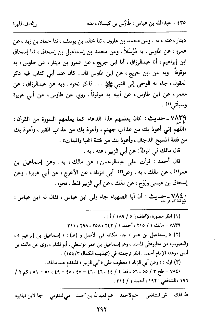 7839 - حَدِيثٌ (ط حم) : كَانَ يُعَلِّمُهُمْ هَذَا الدُّعَاءَ كَمَا يُعَلِّمُهُمُ السُّورَةَ مِنَ الْقُرْآنِ: " اللَّهُمَّ إِنِّي أَعُوذُ بِكَ مِنْ عَذَابِ جَهَنَّمَ، وَأَعُوذُ بِكَ مِنْ عَذَابِ الْقَبْرِ، وَأَعُوذُ بِكَ مِنْ فِتْنَةِ الْمَسِيحِ الدَّجَّالِ، وَأَعُوذُ بِكَ مِنْ فِتْنَةِ الْمَحْيَا وَالْمَمَاتِ ". قَالَ مَالِكٌ فِي الْمُوَطَّإِ: عَنْ أَبِي الزُّبَيْرِ، عَنْهُ، بِهِ. قَالَ أَحْمَدُ: قَرَأْتُ عَلَى عَبْدِ الرَّحْمَنِ، عَنْ مَالِكٍ، بِهِ. وَعَنْ إِسْمَاعِيلَ بْنِ عُمَرَ، عَنْ مَالِكٍ، بِهِ , وَعَنْ أَبِي الزِّنَادِ، عَنِ الأَعْرَجِ، عَنْ أَبِي هُرَيْرَةَ. وَعَنْ إِسْحَاقَ بْنِ عِيسَى، وَرَوْحٍ، عَنْ مَالِكٍ، عَنْ أَبِي الزُّبَيْرِ فَقَطْ، نَحْوَهُ.