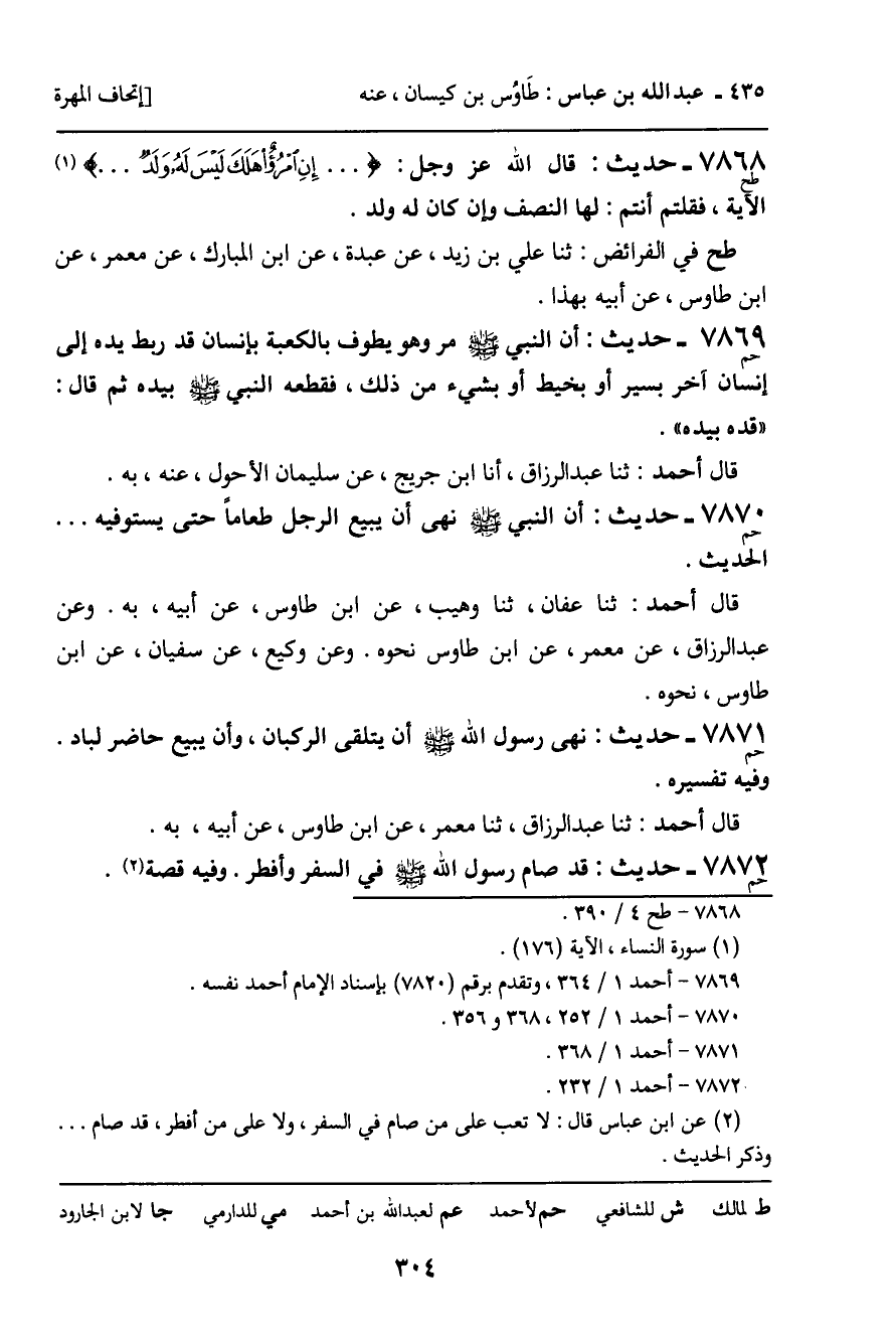 7869 - حَدِيثٌ (حم) : أَنَّ النَّبِيَّ صَلَّى اللَّهُ عَلَيْهِ وَسَلَّمَ، مَرَّ وَهُوَ يَطُوفُ بِالْكَعْبَةِ بِإِنْسَانٍ قَدْ رَبَطَ يَدَهُ إِلَى إِنْسَانٍ آخَرَ بِسَيْرٍ أَوْ بِخَيْطٍ أَوْ بِشَيْءٍ مِنْ ذَلِكَ، فَقَطَعَهُ النَّبِيُّ صَلَّى اللَّهُ عَلَيْهِ وَسَلَّمَ، بِيَدِهِ ثُمَّ قَالَ: " قُدْهُ بِيَدِهِ ". قَالَ أَحْمَدُ: ثنا عَبْدُ الرَّزَّاقِ، أنا ابْنُ جُرَيْجٍ، عَنْ سُلَيْمَانَ الأَحْوَلِ، عَنْهُ، بِهِ.