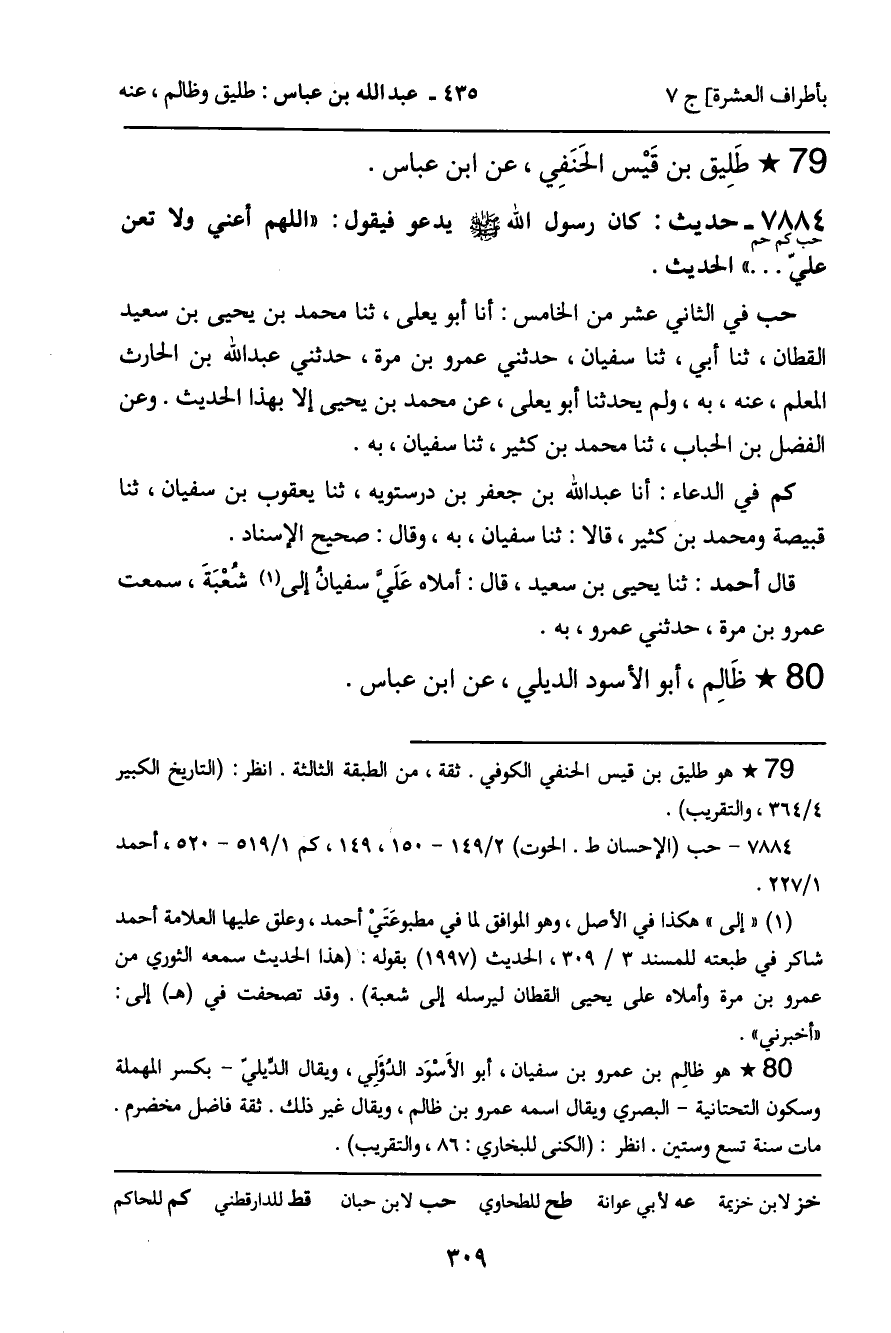 7884 - حَدِيثٌ (حب كم حم) : كَانَ رَسُولُ اللَّهِ صَلَّى اللَّهُ عَلَيْهِ وَسَلَّمَ، يَدْعُو فَيَقُولُ: " اللَّهُمَّ أَعِنِّي وَلا تُعِنْ عَلَيَّ ... " الْحَدِيثَ. حب فِي الثَّانِي عَشَرَ مِنَ الْخَامِسِ: أنا أَبُو يَعْلَى، ثنا مُحَمَّدُ بْنُ يَحْيَى بْنِ سَعِيدٍ الْقَطَّانُ، ثنا أَبِي، ثنا سُفْيَانُ، حَدَّثَنِي عَمْرُو بْنُ مُرَّةَ، حَدَّثَنِي عَبْدُ اللَّهِ بْنُ الْحَارِثِ الْمُعَلِّمُ، عَنْهُ، بِهِ، وَلَمْ يُحَدِّثْنَا أَبُو يَعْلَى، عَنْ مُحَمَّدِ بْنِ يَحْيَى إِلا بِهَذَا الْحَدِيثِ. وَعَنِ الْفَضْلِ بْنِ الْحُبَابِ، ثنا مُحَمَّدُ بْنُ كَثِيرٍ، ثنا سُفْيَانُ، بِهِ. كم فِي الدُّعَاءِ: أنا عَبْدُ اللَّهِ بْنُ جَعْفَرِ بْنِ دُرُسْتُوَيْهِ، ثنا يَعْقُوبُ بْنُ سُفْيَانَ، ثنا قُبَيْصَةُ وَمُحَمَّدُ بْنُ كَثِيرٍ، قَالا: ثنا سُفْيَانُ، بِهِ، وَقَالَ: صَحِيحٌ الإِسْنَادِ. قَالَ أَحْمَدُ: ثنا يَحْيَى بْنُ سَعِيدٍ، قَالَ: أَمْلاهُ عَلَى سُفْيَانَ إِلَى شُعْبَةَ، سَمِعْتُ عَمْرَو بْنَ مُرَّةَ، حَدَّثَنِي عَمْرٌو، بِهِ.