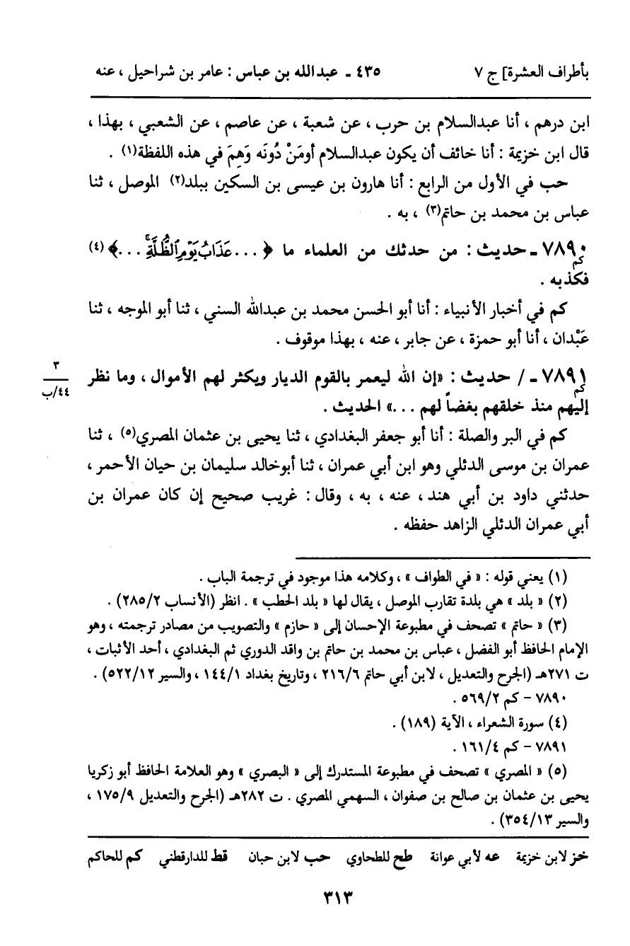 7891 - حَدِيثٌ (كم) : " إِنَّ اللَّهَ لَيَعْمُرُ بِالْقَوْمِ الدِّيَارَ وَيُكْثِرُ لَهُمُ الأَمْوَالَ، وَمَا نَظَرَ إِلَيْهِمْ مُنْذُ خَلَقَهُمْ بُغْضًا لَهُمْ ... " الْحَدِيثَ. كم فِي الْبِرِّ وَالصِّلَةِ: أنا أَبُو جَعْفَرٍ الْبَغْدَادِيُّ، ثنا يَحْيَى بْنُ عُثْمَانَ الْمِصْرِيُّ، ثنا عِمْرَانُ بْنُ مُوسَى الدُّئَلِيُّ وَهُوَ ابْنُ أَبِي عِمْرَانَ، ثنا أَبُو خَالِدٍ سُلَيْمَانُ بْنُ حَيَّانَ الأَحْمَرُ، حَدَّثَنِي دَاوُدُ بْنُ أَبِي هِنْدٍ، عَنْهُ، بِهِ، وَقَالَ: غَرِيبٌ صَحِيحٌ إِنْ كَانَ عِمْرَانُ بْنُ أَبِي عِمْرَانَ الدُّئَلِيُّ الزَّاهِدُ حَفِظَهُ.