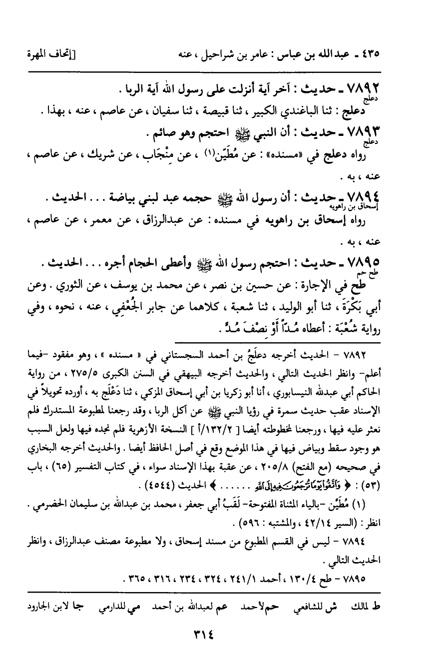 7895 - حَدِيثٌ (طح حم) : احْتَجَمَ رَسُولُ اللَّهِ صَلَّى اللَّهُ عَلَيْهِ وَسَلَّمَ، وَأَعْطَى الْحَجَّامَ أَجْرَهُ ... الْحَدِيثَ. طح فِي الإِجَازَةِ: عَنْ حُسَيْنِ بْنِ نَصْرٍ، عَنْ مُحَمَّدِ بْنِ يُوسُفَ، عَنِ الثَّوْرِيِّ. وَعَنْ أَبِي بَكْرَةَ، ثنا أَبُو الْوَلِيدِ، ثنا شُعْبَةُ: كِلاهُمَا عَنْ جَابِرٍ الْجُعْفِيِّ، عَنْهُ، نَحْوَهُ، وَفِي رِوَايَةِ شُعْبَةَ: أَعْطَاهُ مُدًّا أَوْ نِصْفَ مُدٍّ.