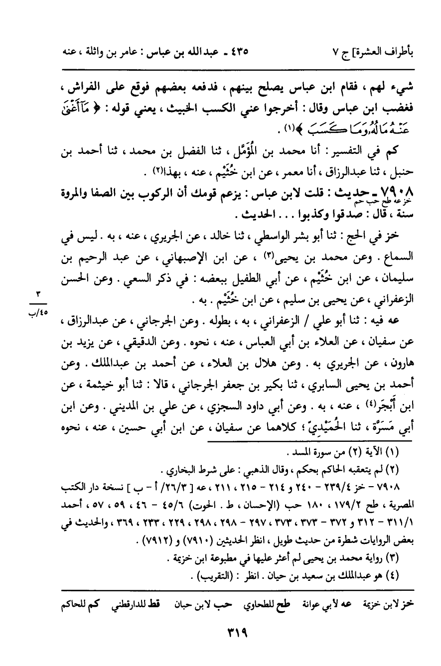 7908 - حَدِيثٌ (خز عه طح حب حم) : قُلْتُ لابْنِ عَبَّاسٍ: يَزْعُمُ قَوْمُكَ أَنَّ الرُّكُوبَ بَيْنَ الصَّفَا وَالْمَرْوَةِ سُنَّةٌ، قَالَ: صَدَقُوا وَكَذَبُوا ... الْحَدِيثَ. خز فِي الْحَجِّ: ثنا أَبُو بِشْرٍ الْوَاسِطِيُّ، ثنا خَالِدٌ، عَنِ الْجَرِيرِيِّ، عَنْهُ، بِهِ. لَيْسَ فِي السَّمَاعِ. وَعَنْ مُحَمَّدِ بْنِ يَحْيَى، عَنِ ابْنِ الأَصْبَهَانِيِّ، عَنْ عَبْدِ الرَّحِيمِ بْنِ سُلَيْمَانَ، عَنِ ابْنِ خُثَيْمٍ، عَنْ أَبِي الطُّفَيْلِ بِبَعْضِهِ: فِي ذِكْرِ السَّعْيِ. وَعَنِ الْحَسَنِ الزَّعْفَرَانِيِّ، عَنْ يَحْيَى بْنِ سُلَيْمٍ، عَنِ ابْنِ خُثَيْمٍ. بِهِ. عه فِيهِ: ثنا أَبُو عَلِيٍّ الزَّعْفَرَانِيُّ، بِهِ، بِطُولِهِ. وَعَنِ الْجُرْجَانِيِّ، عَنْ عَبْدِ الرَّزَّاقِ، عَنْ سُفْيَانَ، عَنِ الْعَلاءِ بْنِ أَبِي الْعَبَّاسِ، عَنْهُ، نَحْوَهُ. وَعَنِ الدَّقِيقِيِّ، عَنْ يَزِيدَ بْنِ هَارُونَ، عَنِ الْجَرِيرِيِّ بِهِ. وَعَنْ هِلالِ بْنِ الْعَلاءِ، عَنْ أَحْمَدَ بْنِ عَبْدِ الْمَلِكِ. وَعَنْ أَحْمَدَ بْنِ يَحْيَى السَّابِرِيِّ، ثنا بُكَيْرُ بْنُ جَعْفَرٍ الْجُرْجَانِيُّ، قَالا: ثنا أَبُو خَيْثَمَةَ، عَنِ ابْنِ أَبْجَرَ، عَنْهُ، بِهِ. وَعَنْ أَبِي دَاوُدَ السِّجْزِيِّ، عَنْ عَلِيِّ بْنِ الْمَدِينِيِّ. وَعَنِ ابْنِ أَبِي مَسَرَّةَ، ثنا الْحُمَيْدِيُّ، كِلاهُمَا عَنْ سُفْيَانَ، عَنِ ابْنِ أَبِي حُسَيْنٍ، عَنْهُ، نَحْوَهُ