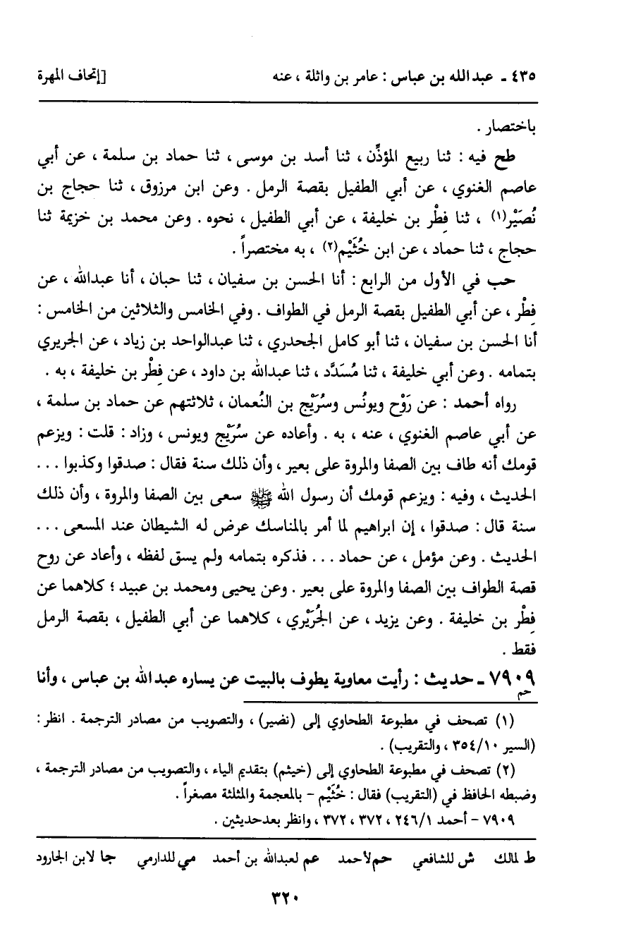 7909 - حَدِيثٌ (حم) : رَأَيْتُ مُعَاوِيَةَ يَطُوفُ بِالْبَيْتِ عَنْ يَسَارِهِ عَبْدُ اللَّهِ بْنُ عَبَّاسٍ، وَأَنَا