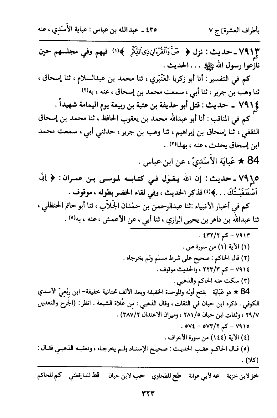7913 - حَدِيثٌ (كم) : نَزَلَ ص وَالْقُرْءَانِ ذِي الذِّكْرِ [سورة: ص، آية 1] فِيهِمْ وَفِي مَجْلِسِهِمْ حِينَ نَازَعُوا رَسُولَ اللَّهِ صَلَّى اللَّهُ عَلَيْهِ وَسَلَّمَ ... الْحَدِيثَ. كم فِي التَّفْسِيرِ: أنا أَبُو زَكَرِيَّا الْعَنْبَرِيُّ، ثنا مُحَمَّدُ بْنُ عَبْدِ السَّلامِ، ثنا إِسْحَاقُ، ثنا وَهْبُ بْنُ جَرِيرٍ، ثنا أَبِي، سَمِعْتُ مُحَمَّدَ بْنَ إِسْحَاقَ، عَنْهُ، بِهِ.