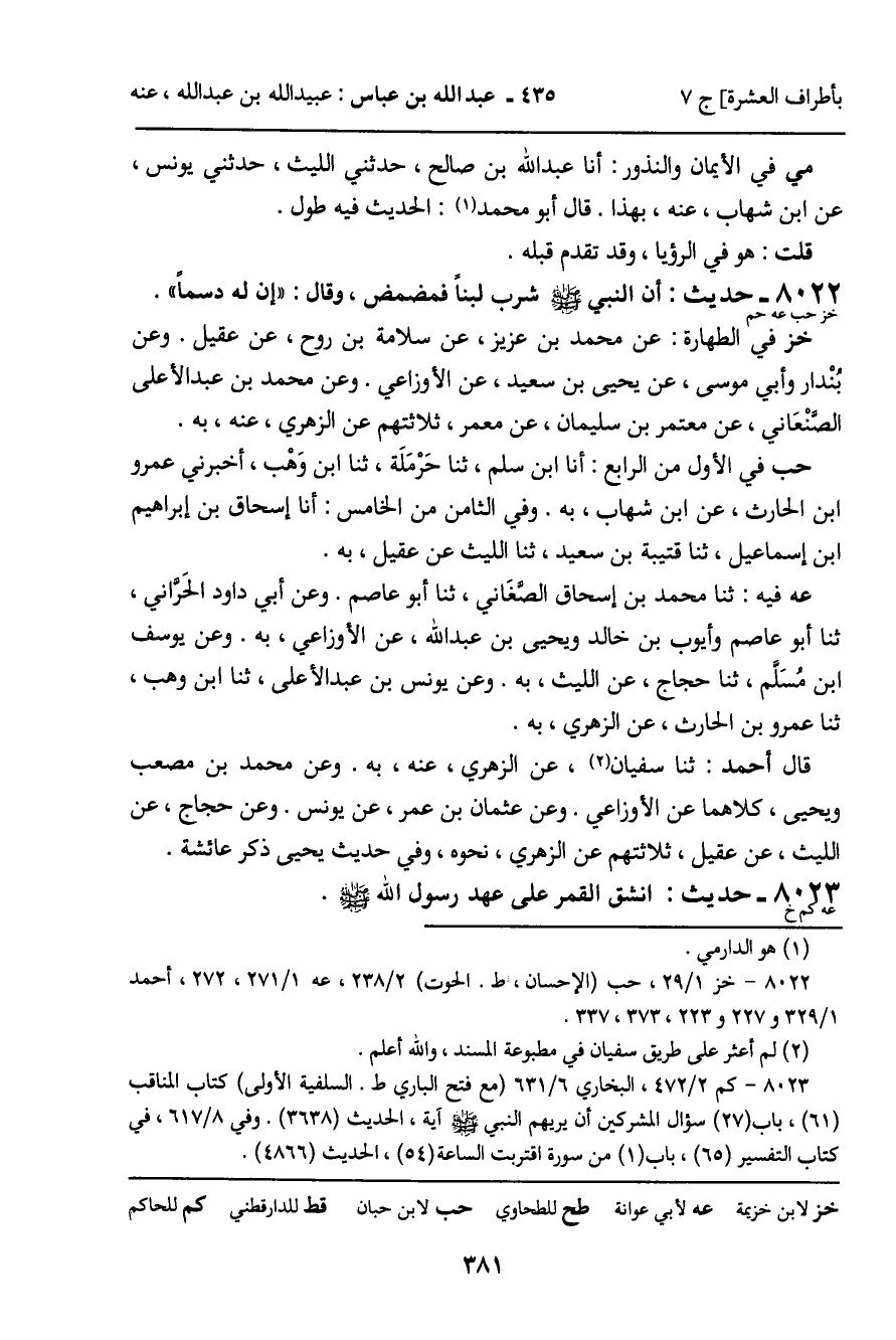 8022 - حَدِيثٌ (خز حب عه حم) : أَنَّ النَّبِيَّ صَلَّى اللَّهُ عَلَيْهِ وَسَلَّمَ، شَرِبَ لَبَنًا فَمَضْمَضَ، وَقَالَ: " إِنَّ لَهُ دَسَمًا ". خز فِي الطَّهَارَةِ: عَنْ مُحَمَّدِ بْنِ عَبْدِ الْعَزِيزِ، عَنْ سَلامَةَ بْنِ رَوْحٍ، عَنْ عَقِيلٍ، وَعَنْ بُنْدَارٍ، وَأَبِي مُوسَى، عَنْ يَحْيَى بْنِ سَعِيدٍ، عَنِ الأَوْزَاعِيِّ. وَعَنْ مُحَمَّدِ بْنِ عَبْدِ الأَعْلَى الصَّنْعَانِيِّ، عَنْ مُعَتْمَرِ بْنِ سُلَيْمَانَ، عَنْ مَعْمَرٍ، ثَلاثَتُهُمْ، عَنِ الزُّهْرِيِّ، عَنْهُ، بِهِ. حب فِي الأَوَّلِ مِنَ الرَّابِعِ: أنا ابْنُ سَلْمٍ، ثنا حَرْمَلَةُ، ثنا ابْنُ وَهْبٍ، أَخْبَرَنِي عَمْرُو بْنُ الْحَارِثِ، عَنِ ابْنِ شِهَابٍ، بِهِ. وَفِي الثَّامِنِ مِنَ الْخَامِسِ: أنا إِسْحَاقُ بْنُ إِبْرَاهِيمَ بْنِ إِسْمَاعِيلَ، ثنا قُتَيْبَةُ بْنُ سَعِيدٍ، ثنا اللَّيْثُ عَنْ عَقِيلٍ، بِهِ.