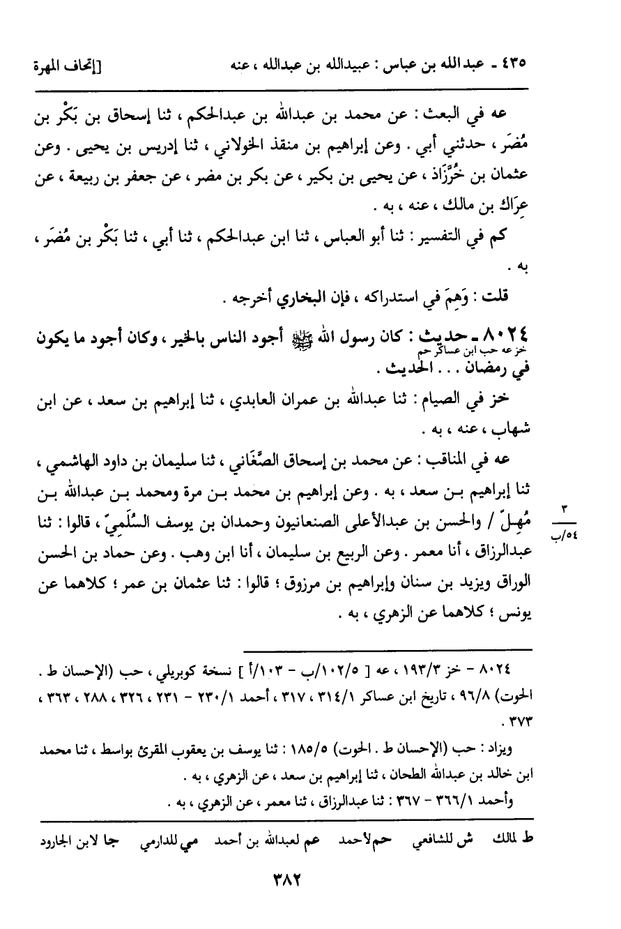 8024 - حَدِيثٌ (خز عه حب ابن عساكر حم) : كَانَ رَسُولُ اللَّهِ صَلَّى اللَّهُ عَلَيْهِ وَسَلَّمَ، أَجْوَدَ النَّاسِ بِالْخَيْرِ، وَكَانَ أَجْوَدَ مَا يَكُونُ فِي رَمَضَانَ ... الْحَدِيثَ. خز فِي الصِّيَامِ: ثنا عَبْدُ اللَّهِ بْنُ عِمْرَانَ الْعَابِدِيُّ، ثنا إِبْرَاهِيمُ بْنُ سَعْدٍ، عَنِ ابْنِ شِهَابٍ، عَنْهُ، بِهِ. عه فِي الْمَنَاقِبِ: عَنْ مُحَمَّدِ بْنِ إِسْحَاقَ الصَّغَانِيِّ، ثنا سُلَيْمَانُ بْنُ دَاوُدَ الْهَاشِمِيُّ، ثنا إِبْرَاهِيمُ بْنُ سَعْدٍ، بِهِ. وَعَنْ إِبْرَاهِيمَ بْنِ مُحَمَّدِ بْنِ مُرَّةَ، وَمُحَمَّدِ بْنِ عَبْدِ اللَّهِ بْنِ مُهِلٍّ، وَالْحَسَنِ بْنِ عَبْدِ الأَعْلَى الصَّنْعَانِيِّينَ، وَحَمْدَانَ بْنِ يُوسُفَ السُّلَمِيِّ، قَالُوا: ثنا عَبْدُ الرَّزَّاقِ، أنا مَعْمَرٌ. وَعَنِ الرَّبِيعِ بْنِ سُلَيْمَانَ، أنا ابْنُ وَهْبٍ. وَعَنْ حَمَّادِ بْنِ الْحَسَنِ الْوَرَّاقِ، وَيَزِيدَ بْنِ سِنَانٍ، وَإِبْرَاهِيمَ بْنِ مَرْزُوقٍ؛ قَالُوا: ثنا عُثْمَانُ بْنُ عُمَرَ؛ كِلاهُمَا عَنْ يُونُسَ؛ كِلاهُمَا عَنِ الزُّهْرِيِّ، بِهِ.