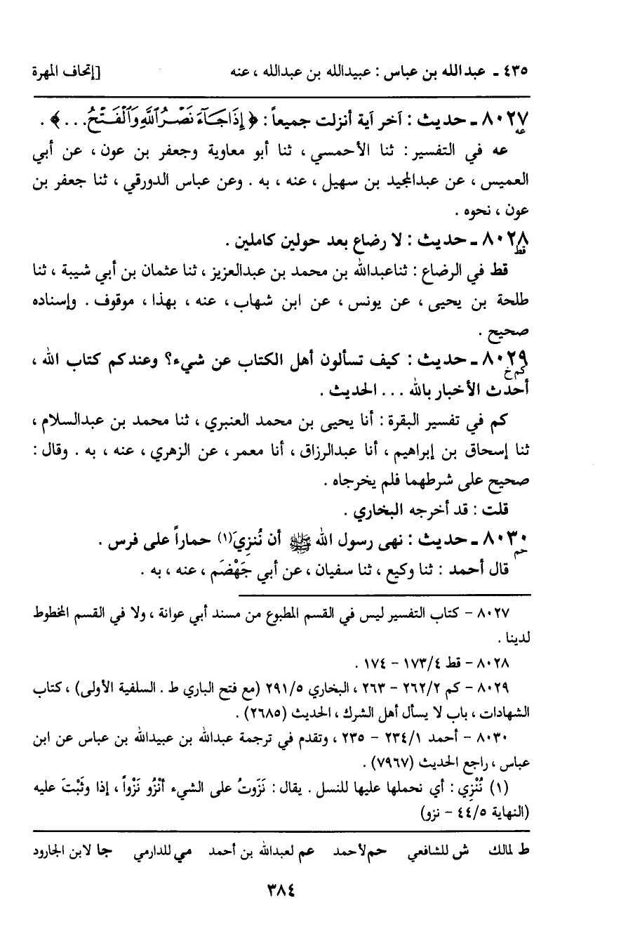 8027 - حَدِيثٌ (عه) : آخِرُ آيَةٍ أُنْزِلَتْ جَمِيعًا: إِذَا جَاءَ نَصْرُ اللَّهِ وَالْفَتْحُ [سورة: النصر، آية 1] . عه فِي التَّفْسِيرِ: ثنا الأَحْمَسِيُّ، ثنا أَبُو مُعَاوِيَةَ، وَجَعْفَرُ بْنُ عَوْنٍ، عَنْ أَبِي الْعُمَيْسِ، عَنْ عَبْدِ الْمَجِيدِ بْنِ سُهَيْلٍ، عَنْهُ، بِهِ. وَعَنْ عَبَّاسٍ الدَّوْرَقِيِّ، ثنا جَعْفَرُ بْنُ عَوْنٍ، نَحْوَهُ.