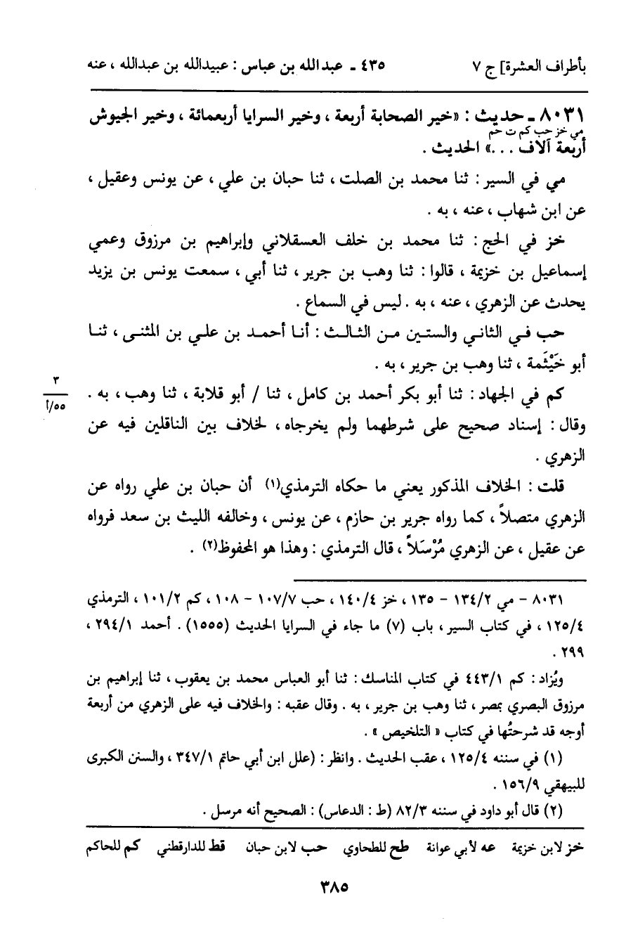 8031 - حَدِيثٌ (مي خز حب كم ت حم) : " خَيْرُ الصَّحَابَةِ أَرْبَعَةٌ، وَخَيْرُ السَّرَايَا أَرْبَعُمِائَةٍ، وَخَيْرُ الْجُيُوشِ أَرْبَعَةُ آلافٍ. . " الْحَدِيثَ. مي فِي السِّيَرِ: ثنا مُحَمَّدُ بْنُ الصَّلْتِ، ثنا حِبَّانُ بْنُ عَلِيٍّ، عَنْ يُونُسَ وَعَقِيلٍ، عَنِ ابْنِ شِهَابٍ، عَنْهُ، بِهِ. خز فِي الْحَجِّ: ثنا مُحَمَّدُ بْنُ خَلَفٍ الْعَسْقَلانِيُّ، وَإِبْرَاهِيمُ بْنُ مَرْزُوقٍ وَعَمِّي إِسْمَاعِيلُ بْنُ خُزَيْمَةَ، قَالُوا: ثنا وَهْبُ بْنُ جَرِيرٍ، ثنا أَبِي، سَمِعْتُ يُونُسَ بْنَ يَزِيدَ يُحَدِّثُ عَنِ الزُّهْرِيِّ، عَنْهُ، بِهِ. لَيْسَ فِي السَّمَاعِ. حب فِي الثَّانِي وَالسِّتِّينَ مِنَ الثَّالِثِ: أنا أَحْمَدُ بْنُ عَلِيِّ بْنِ الْمُثَنَّى، ثنا أَبُو خَيْثَمَةَ، ثنا وَهْبُ بْنُ جَرِيرٍ، بِهِ. كم فِي الْجِهَادِ: ثنا أَبُو بَكْرٍ أَحْمَدُ بْنُ كَامِلٍ، ثنا أَبُو قِلابَةَ، ثنا وَهْبٌ، بِهِ. وَقَالَ: إِسْنَادٌ صَحِيحٌ عَلَى شَرْطِهِمَا وَلَمْ يُخَرِّجَاهُ، لِخِلافٍ بَيْنَ النَّاقِلِينَ فِيهِ عَنِ الزُّهْرِيِّ. قُلْتُ: الْخِلافُ الْمَذْكُورُ يَعْنِي مَا حَكَاهُ التِّرْمِذِيُّ أَنَّ حِبَّانَ بْنَ عَلِيٍّ رَوَاهُ عَنِ الزُّهْرِيِّ مُتَّصِلا، كَمَا رَوَاهُ جَرِيرُ بْنُ حَازِمٍ، عَنْ يُونُسَ، وَخَالَفَهُ اللَّيْثُ بْنُ سَعْدٍ فَرَوَاهُ عَنْ عَقِيلٍ، عَنِ الزُّهْرِيِّ مُرْسَلا، قَالَ التِّرْمِذِيُّ: وَهَذَا هُوَ الْمَحْفُوظُ.