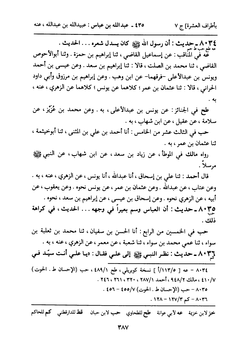 8034 - حَدِيثٌ (عه طح حب ط حم) : أَنَّ رَسُولَ اللَّهِ صَلَّى اللَّهُ عَلَيْهِ وَسَلَّمَ كَانَ يَسْدُلُ شَعْرَهُ ... الْحَدِيثَ. عه فِي الْمَنَاقِبِ: عَنْ إِسْمَاعِيلَ الْقَاضِي، ثنا إِبْرَاهِيمُ بْنُ حَمْزَةَ. وثنا أَبُو الأَحْوَصِ الْقَاضِي، ثنا مُحَمَّدُ بْنُ الصَّلْتِ، قَالا: ثنا إِبْرَاهِيمُ بْنُ سَعْدٍ. وَعَنْ عِيسَى بْنِ أَحْمَدَ، وَيُونُسَ بْنِ عَبْدِ الأَعْلَى، فَرَّقَهُمَا، عَنِ ابْنِ وَهْبٍ. وَعَنْ إِبْرَاهِيمَ بْنِ مَرْزُوقٍ، وَأَبِي دَاوُدَ الْحَرَّانِيِّ، قَالا: ثنا عُثْمَانُ بْنُ عُمَرَ؛ كِلاهُمَا عَنْ يُونُسَ، كِلاهُمَا عَنِ الزُّهْرِيِّ، عَنْهُ، بِهِ. طح فِي الْجَنَائِزِ: عَنْ يُونُسَ بْنِ عَبْدِ الأَعْلَى، بِهِ. وَعَنْ مُحَمَّدِ بْنِ عُزَيْزٍ، عَنْ سَلامَةَ، عَنْ عَقِيلٍ، عَنِ ابْنِ شِهَابٍ، بِهِ. حب فِي الثَّالِثَ عَشَرَ مِنَ الْخَامِسِ: أنا أَحْمَدُ بْنُ عَلِيِّ بْنِ الْمُثَنَّى، ثنا أَبُو خَيْثَمَةَ، ثنا عُثْمَانُ بْنُ عُمَرَ، بِهِ.