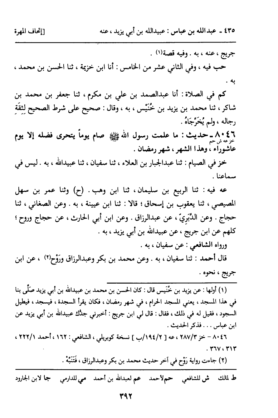 8046 - حَدِيثٌ (خز عه ش حم) : مَا عَلِمْتُ رَسُولَ اللَّهِ صَلَّى اللَّهُ عَلَيْهِ وَسَلَّمَ صَامَ يَوْمًا يَتَحَرَّى فَضْلَهُ إِلا يَوْمَ عَاشُورَاءَ، وَهَذَا الشَّهْرَ، شَهْرَ رَمَضَانَ. خز فِي الصِّيَامِ: ثنا عَبْدُ الْجَبَّارِ بْنُ الْعَلاءِ، ثنا سُفْيَانُ، ثنا عُبَيْدُ اللَّهِ، بِهِ. لَيْسَ فِي سَمَاعِنَا. عه فِيهِ: ثنا الرَّبِيعُ بْنُ سُلَيْمَانَ، ثنا ابْنُ وَهْبٍ، (ح) وثنا عُمَرُ بْنُ سَهْلٍ الْمِصِّيصِيُّ، ثنا يَعْقُوبُ بْنُ إِسْحَاقَ؛ قَالا: ثنا ابْنُ عُيَيْنَةَ، بِهِ. وَعَنِ الصَّغَانِيِّ، ثنا حَجَّاجٌ. وَعَنِ الدَّبَرِيِّ، عَنْ عَبْدِ الرَّزَّاقِ. عَنِ ابْنِ أَبِي الْحَارِثِ، عَنْ حَجَّاجٍ وَرَوْحٍ، كُلُّهُمْ عَنِ ابْنِ جُرَيْجٍ، عَنْ عُبَيْدِ اللَّهِ بْنِ أَبِي يَزِيدَ، بِهِ. وَرَوَاهُ الشَّافِعِيُّ: عَنْ سُفْيَانَ، بِهِ. قَالَ أَحْمَدُ: ثنا سُفْيَانُ، بِهِ. وَعَنْ مُحَمَّدِ بْنِ بَكْرٍ، وَعَبْدِ الرَّزَّاقِ، وَرَوْحٍ، عَنِ ابْنِ جُرَيْجٍ، نَحْوَهُ.