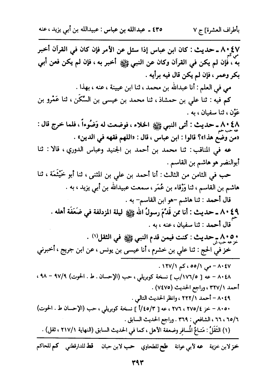 8048 - حَدِيثٌ (عه حب حم) : أَتَى النَّبِيُّ صَلَّى اللَّهُ عَلَيْهِ وَسَلَّمَ الْخَلاءَ، فَوَضَعْتُ لَهُ وَضُوءًا، فَلَمَّا خَرَجَ قَالَ: " مَنْ وَضَعَ هَذَا "؟ قَالُوا: ابْنُ عَبَّاسٍ، قَالَ: " اللَّهُمَّ فَقِّهْهُ فِي الدِّينِ ". عه فِي الْمَنَاقِبِ: ثنا مُحَمَّدُ بْنُ أَحْمَدَ بْنِ الْجُنَيْدِ، وَعَبَّاسٌ الدُّورِيُّ، قَالا: ثنا أَبُو النَّضْرِ هُوَ هَاشِمُ بْنُ الْقَاسِمِ. حب فِي الثَّامِنِ مِنَ الثَّالِثِ: أنا أَحْمَدُ بْنُ عَلِيِّ بْنِ الْمُثَنَّى، ثنا أَبُو خَيْثَمَةَ، ثنا هَاشِمُ بْنُ الْقَاسِمِ، ثنا وَرْقَاءُ بْنُ عُمَرَ، سَمِعْتُ عُبَيْدَ اللَّهِ بْنَ أَبِي يَزِيدَ، بِهِ. قَالَ أَحْمَدُ: ثنا هَاشِمٌ، هُوَ ابْنُ الْقَاسِمِ، بِهِ.