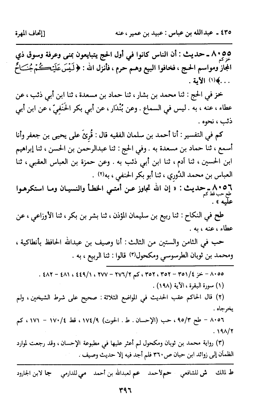 8055 - حَدِيثٌ (خز كم) : أَنَّ النَّاسَ كَانُوا فِي أَوَّلِ الْحَجِّ يَتَبَايَعُونَ بِمِنًى وَعَرَفَةَ وَسُوقِ ذِي الْمَجَازِ وَمَوَاسِمِ الْحَجِّ، فَخَافُوا الْبَيْعَ وَهُمْ حُرُمٌ، فَأَنْزَلَ اللَّهُ: لَيْسَ عَلَيْكُمْ جُنَاحٌ [سورة: البقرة، آية 198] الآيَةَ. خز فِي الْحَجِّ: ثنا مُحَمَّدُ بْنُ بَشَّارٍ، ثنا حَمَّادُ بْنُ مَسْعَدَةَ، ثنا ابْنُ أَبِي ذِئْبٍ، عَنْ عَطَاءٍ، عَنْهُ، بِهِ. لَيْسَ فِي السَّمَاعِ. وَعَنْ بُنْدَارٍ، عَنْ أَبِي بَكْرٍ الْحَنَفِيِّ، عَنِ ابْنِ أَبِي ذِئْبٍ، نَحْوَهُ.