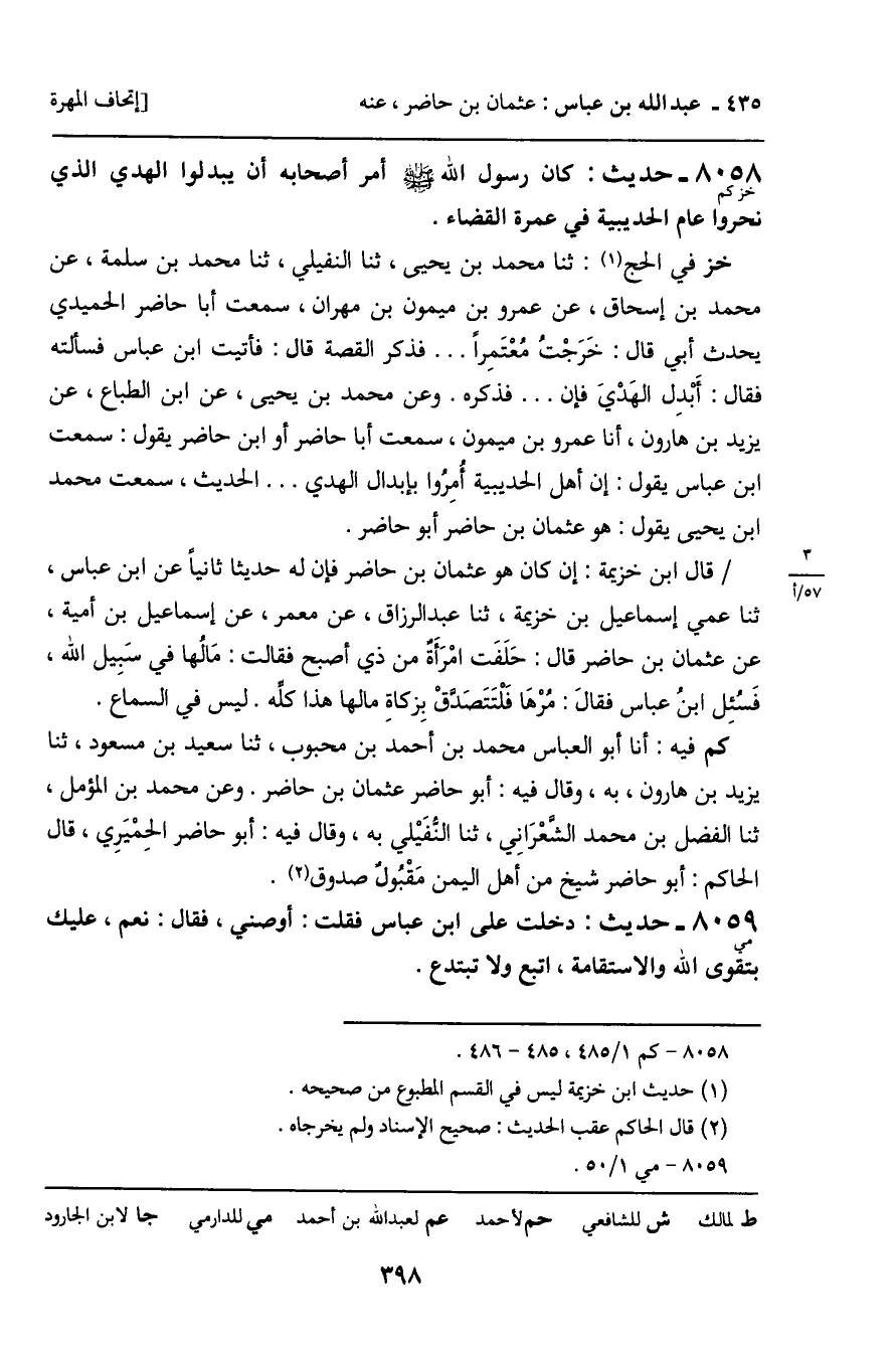 8058 - حَدِيثٌ (خز كم) : كَانَ رَسُولُ اللَّهِ صَلَّى اللَّهُ عَلَيْهِ وَسَلَّمَ، أَمَرَ أَصْحَابَهُ أَنْ يُبَدِّلُوا الْهَدْيَ الَّذِي نَحَرُوا عَامَ الْحُدَيْبِيَةِ فِي عُمْرَةِ الْقَضَاءِ. خز فِي الْحَجِّ: ثنا مُحَمَّدُ بْنُ يَحْيَى، ثنا النُّفَيْلِيُّ، ثنا مُحَمَّدُ بْنُ سَلَمَةَ، عَنْ مُحَمَّدِ بْنِ إِسْحَاقَ، عَنْ عَمْرِو بْنِ مَيْمُونِ بِنْ مِهْرَانَ، سَمِعْتُ أَبَا حَاضِرٍ الْحميدِيَّ يُحَدِّثُ أَبِي قَالَ: خَرَجْتُ مُعْتَمِرًا ... فَذَكَرَ الْقِصَّةَ قَالَ: فَأَتَيْتُ ابْنَ عَبَّاسٍ فَسَأَلْتُهُ فَقَالَ: أَبْدِلِ الْهَدْيَ فَإِنَّ ... فَذَكَرَهُ. وَعَنْ مُحَمَّدِ بْنِ يَحْيَى، عَنِ ابْنِ الطَّبَّاعِ، عَنْ يَزِيدَ بْنِ هَارُونَ، أنا عَمْرُو بْنُ مَيْمُونٍ، سَمِعْتُ أَبَا حَاضِرٍ أَوِ ابْنَ حَاضِرٍ يَقُولُ: سَمِعْتُ ابْنَ عَبَّاسٍ يَقُولُ: إِنَّ أَهْلَ الْحُدَيْبِيَةِ أُمِرُوا بِإِبْدَالِ الْهَدْيِ ... الْحَدِيثَ، سَمِعْتُ مُحَمَّدَ بْنَ يَحْيَى يَقُولُ: هُوَ عُثْمَانُ بْنُ حَاضِرٍ أَبُو حَاضِرٍ.