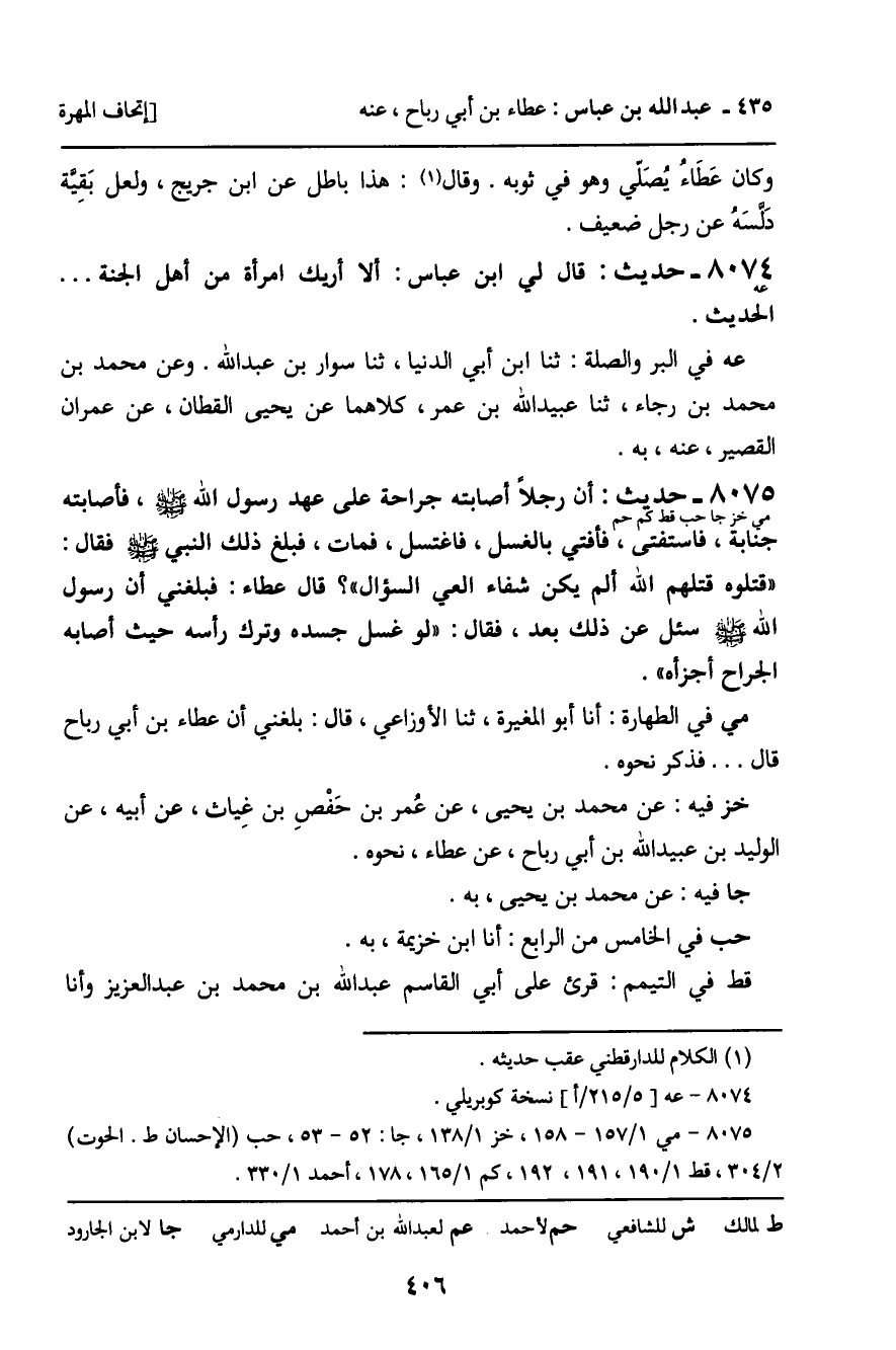 8075 - حَدِيثٌ (مي خز جا حب قط كم حم) : أَنَّ رَجُلا أَصَابَتْهُ جِرَاحَةٌ عَلَى عَهْدِ رَسُولِ اللَّهِ صَلَّى اللَّهُ عَلَيْهِ وَسَلَّمَ،، فَأَصَابَتْهُ جَنَابَةٌ، فَاسْتَفْتَى، فَأُفْتِيَ بِالْغُسْلِ، فَاغْتَسَلَ، فَمَاتَ. فَبَلَغَ ذَلِكَ النَّبِيَّ صَلَّى اللَّهُ عَلَيْهِ وَسَلَّمَ، فَقَالَ: " قَتَلُوهُ قَتَلَهُمُ اللَّهُ أَلَمْ يَكُنْ شِفَاءُ الْعَيِّ السُّؤَالَ؟ قَالَ عَطَاءٌ: فَبَلَغَنِي أَنَّ رَسُولَ اللَّهِ صَلَّى اللَّهُ عَلَيْهِ وَسَلَّمَ، سُئِلَ عَنْ ذَلِكَ بَعْدُ، فَقَالَ: " لَوْ غَسَلَ جَسَدَهُ، وَتَرَكَ رَأْسَهُ حَيْثُ أَصَابَهُ الْجِرَاحُ أَجْزَأَهُ ". مي فِي الطَّهَارَةِ: أنا أَبُو الْمُغِيرَةِ، ثنا الأَوْزَاعِيُّ، قَالَ: بَلَغَنِي أَنَّ عَطَاءَ بْنَ أَبِي رَبَاحٍ قَالَ ... فَذَكَرَ نَحْوَهُ. خز فِيهِ: عَنْ مُحَمَّدِ بْنِ يَحْيَى، عَنْ عُمَرَ بْنِ حَفْصِ بِنْ غِيَاثٍ، عَنْ أَبِيهِ، عَنِ الْوَلِيدِ بْنِ عُبَيْدِ اللَّهِ بْنِ أَبِي رَبَاحٍ، عَنْ عَطَاءٍ، نَحْوَهُ. جا فِيهِ: عَنْ مُحَمَّدِ بْنِ يَحْيَى، بِهِ.