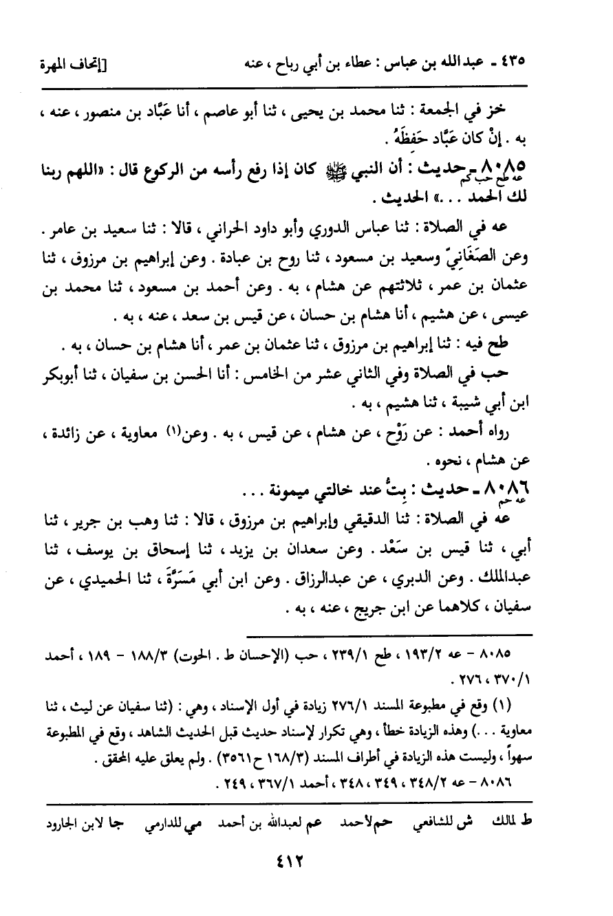 8085 - حَدِيثٌ (عه طح حب كم) : أَنَّ النَّبِيَّ صَلَّى اللَّهُ عَلَيْهِ وَسَلَّمَ، كَانَ إِذَا رَفَعَ رَأْسَهُ مِنَ الرُّكُوعِ قَالَ: " اللَّهُمَّ رَبَّنَا لَكَ الْحَمْدُ ... " الْحَدِيثَ. عه فِي الصَّلاةِ: ثنا عَبَّاسٌ الدُّورِيُّ، وَأَبُو دَاوُدَ الْحَرَّانِيُّ، قَالا: ثنا سَعِيدُ بْنُ عَامِرٍ. وَعَنِ الصَّغَانِيِّ، وَسَعِيدِ بْنِ مَسْعُودٍ، ثنا رَوْحُ بْنُ عُبَادَةَ. وَعَنْ إِبْرَاهِيمَ بْنِ مَرْزُوقٍ، ثنا عُثْمَانُ بْنُ عُمَرَ، ثَلاثَتُهُمْ عَنْ هِشَامٍ، بِهِ. وَعَنْ أَحْمَدَ بْنِ مَسْعُودٍ، ثنا مُحَمَّدُ بْنُ عِيسَى، عَنْ هُشَيْمٍ، أنا هِشَامُ بْنُ حَسَّانٍ، عَنْ قَيْسِ بْنِ سَعْدٍ، عَنْهُ، بِهِ. طح فِيهِ: ثنا إِبْرَاهِيمُ بْنُ مَرْزُوقٍ، ثنا عُثْمَانُ بْنُ عُمَرَ، أنا هِشَامُ بْنُ حَسَّانٍ، بِهِ. حب فِي الصَّلاةِ وَفِي الثَّانِي عَشَرَ مِنَ الْخَامِسِ: أنا الْحَسَنُ بْنُ سُفْيَانَ، ثنا أَبُو بَكْرِ بْنُ أَبِي شَيْبَةَ، ثنا هُشَيْمٌ، بِهِ. رَوَاهُ أَحْمَدُ: عَنْ رَوْحٍ، عَنْ هِشَامٍ، عَنْ قَيْسٍ، بِهِ. وَعَنْ مُعَاوِيَةَ، عَنْ زَائِدَةَ، عَنْ هِشَامٍ، نَحْوَهُ.