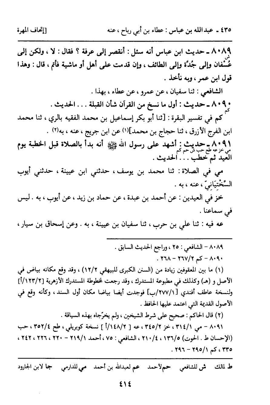 8091 - حَدِيثٌ (مي خز عه طح حب ش حم كم) : أَشْهَدُ عَلَى رَسُولِ اللَّهِ صَلَّى اللَّهُ عَلَيْهِ وَسَلَّمَ أَنَّهُ بَدَأَ بِالصَّلاةِ قَبْلَ الْخُطْبَةِ يَوْمَ الْعِيدِ ثُمَّ خَطَبَ ... الْحَدِيثَ. مي فِي الصَّلاةِ: ثنا مُحَمَّدُ بْنُ يُوسُفَ، حَدَّثَنِي ابْنُ عُيَيْنَةَ، حَدَّثَنِي أَيُّوبُ السِّخْتِيَانِيُّ، عَنْهُ، بِهِ. خز فِي الْعِيدَيْنِ: عَنْ أَحْمَدَ بْنِ عَبْدَةَ، عَنْ حَمَّادِ بْنِ زَيْدٍ، عَنْ أَيُّوبَ، بِهِ. لَيْسَ فِي سَمَاعِنَا. عه فِيهِ: ثنا عَلِيُّ بْنُ حَرْبٍ، ثنا سُفْيَانُ بْنُ عُيَيْنَةَ، بِهِ. وَعَنْ إِسْحَاقَ بْنِ سَيَّارٍ،