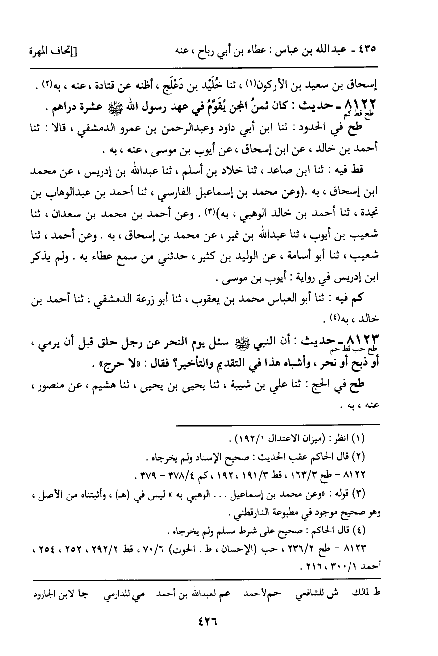 -[427]- حب فِي الثَّالِثِ وَالْعِشْرِينَ مِنَ الرَّابِعِ: أنا أَحْمَدُ بْنُ يَحْيَى بْنِ زُهَيْرٍ، ثنا يَعْقُوبُ بْنُ إِبْرَاهِيمَ الدَّوْرَقِيُّ، ثنا هُشَيْمٌ، بِهِ. قط فِي الْحَجِّ: ثنا أَبُو مُحَمَّدِ بْنُ صَاعِدٍ، ثنا مَحْمُودُ بْنُ خِدَاشٍ وَيَعْقُوبُ الدَّوْرَقِيُّ، قَالا: ثنا هُشَيْمٌ، بِهِ. وَفِيهِ: ثنا أَبُو بَكْرٍ النَّيْسَابُورِيُّ، ثنا الْعَبَّاسُ بْنُ مُحَمَّدٍ، ثنا رَوْحٌ، ثنا هِشَامٌ، عَنْهُ، بِهَذَا. وَعَنْ أَبِي بَكْرٍ النَّيْسَابُورِيِّ، ثنا الْعَبَّاسُ بْنُ مُحَمَّدٍ، ثنا رَوْحٌ، ثنا ابْنُ جُرَيْجٍ قَالَ: قَالَ عَطَاءٌ وَغَيْرُهُ: هَؤُلاءِ الثَّلاثُ عَنِ النَّبِيِّ صَلَّى اللَّهُ عَلَيْهِ وَسَلَّمَ فِي الْحَلْقِ قَبْلَ الرَّمْيِ، وَالنَّحْرِ قَبْلَ الْحَلْقِ، وَالنَّحْرِ قَبْلَ الرَّمْيِ. وَعَنْ إِسْمَاعِيلَ بْنِ مُحَمَّدٍ الصَّفَّارِ، ثنا الْعَبَّاسُ بْنُ مُحَمَّدٍ، ثنا أَحْمَدُ بْنُ يُونُسَ، ثنا أَبُو بَكْرِ بْنُ عَيَّاشٍ، ثنا عَبْدُ الْعَزِيزِ بْنُ رُفَيْعٍ، عَنْ عَطَاءٍ، عَنِ ابْنِ عَبَّاسٍ، نَحْوَهُ. قَالَ أَحْمَدُ: ثنا رَوْحٌ، ثنا هِشَامٌ، عَنْهُ، بِهِ. ثنا هُشَيْمٌ، أنا مَنْصُورٌ، عَنْهُ، نَحْوَهُ.
