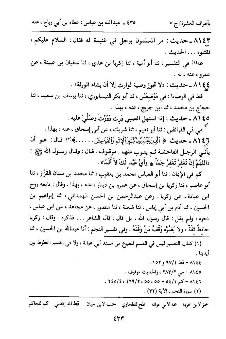 8146 - حديث (كم) : الَّذِينَ يَجْتَنِبُونَ كَبَائِرَ الإِثْمِ وَالْفَوَاحِشَ [سورة: النجم، آية 32] قَالَ: هُوَ أَنْ يَأْتِيَ الرَّجُلُ الْفَاحِشَةَ ثُمَّ يَتُوبَ مِنْهَا. مَوْقُوفٌ. قَالَ: وَقَالَ رَسُولُ اللَّهِ صَلَّى اللَّهُ عَلَيْهِ وَسَلَّمَ: " اللَّهُمَّ إِنْ تَغْفِرْ تَغْفِرْ جَمًّا وَأَيُّ عَبْدٍ لَكَ لا أَلَمَّا ". كم فِي الإِيمَانِ: ثنا أَبُو الْعَبَّاسِ مُحَمَّدُ بْنُ يَعْقُوبَ، ثنا مُحَمَّدُ بْنُ سِنَانٍ الْقَزَّازُ، ثنا أَبُو عَاصِمٍ، ثنا زَكَرِيَّا بْنُ إِسْحَاقَ، عَنْ عَمْرِو بْنِ دِينَارٍ، عَنْهُ، بِهَذَا. وَقَالَ: تَابَعَهُ رَوْحُ بْنُ عُبَادَةَ، عَنْ زَكَرِيَّا. وَعَنْ عَبْدِ الرَّحْمَنِ بْنِ الْحَسَنِ الْهَمْدَانِيِّ، ثنا إِبْرَاهِيمُ بْنُ الْحُسَيْنِ، ثنا آدَمُ بْنُ أَبِي إِيَاسٍ، ثنا شُعْبَةُ، ثنا مَنْصُورٌ، عَنْ مُجَاهِدٍ، عَنِ ابْنِ عَبَّاسٍ، نَحْوَهُ، وَلَمْ يَقُلْ: قَالَ رَسُولُ اللَّهِ، بَلْ قَالَ: قَالَ الشَّاعِرُ ... فَذَكَرَهُ. وَقَالَ: زَكَرِيَّا حَافِظٌ ثِقَةٌ، وَلا يَضُرُّهُ وَقْفُ مَنْ وَقَفَهُ. وَفِي تَفْسِيرِ النَّجْمِ: أنا عَبْدُ اللَّهِ بْنُ الْحُسَيْنِ، ثنا