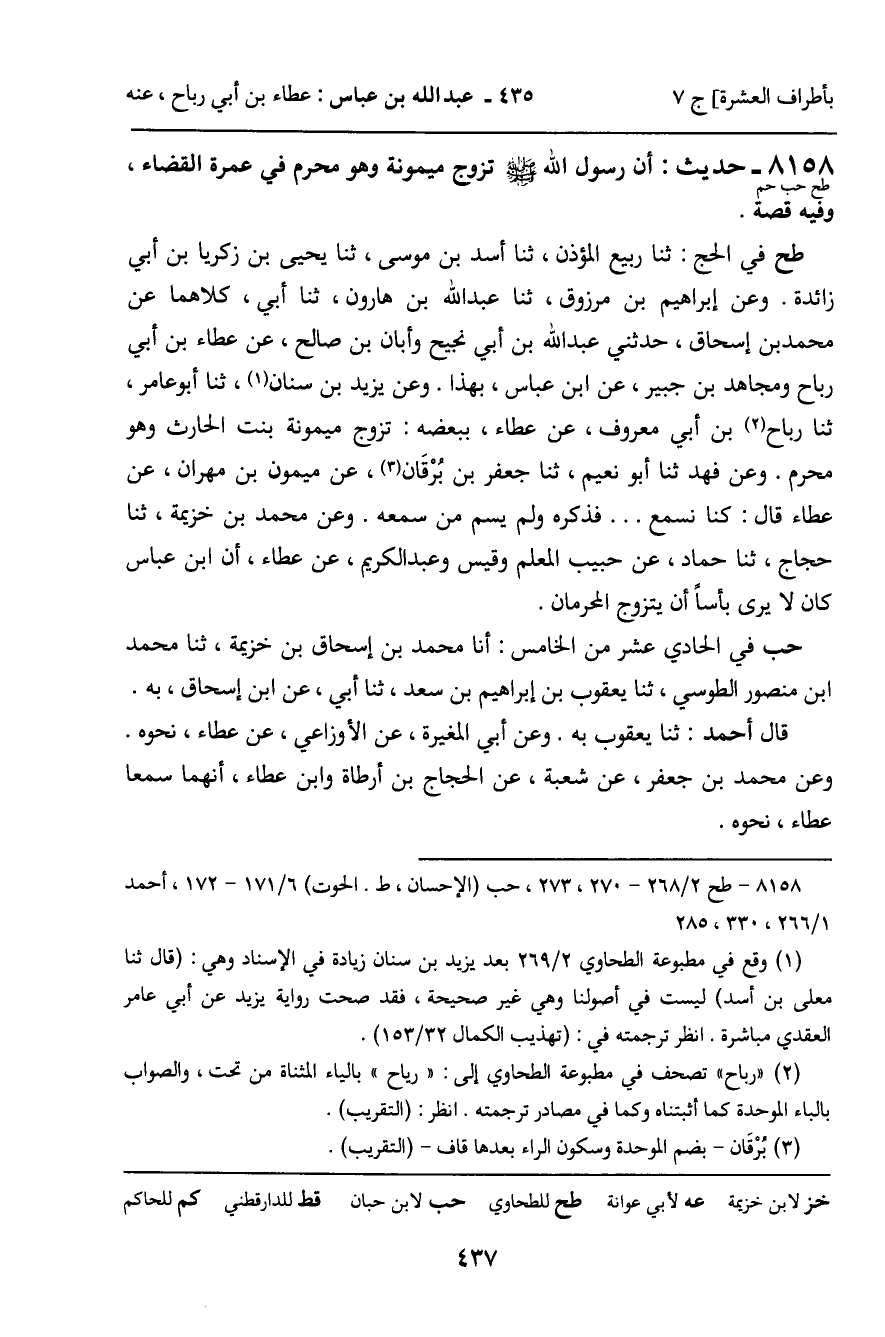 8158 - حَدِيثٌ (طح حب حم) : أَنَّ رَسُولَ اللَّه صَلَّى اللَّهُ عَلَيْهِ وَسَلَّمَ، تَزَوَّجَ مَيْمُونَةَ وَهُوَ مُحْرِمٌ فِي عُمْرَةِ الْقَضَاءِ وَفِيهِ قِصَّةٌ. طح فِي الْحَجِّ: ثنا رَبِيعٌ الْمُؤَذِّنُ، ثنا أَسَدُ بْنُ مُوسَى، ثنا يَحْيَى بْنُ زَكَرِيَّا بْنِ أَبِي زَائِدَةَ. وَعَنْ إِبْرَاهِيمَ بْنِ مَرْزُوقٍ، ثنا عَبْدُ اللَّهِ بْنُ هَارُونَ، ثنا أَبِي: كِلاهُمَا عَنْ مُحَمَّدِ بْنِ إِسْحَاقَ، حَدَّثَنِي عَبْدُ اللَّهِ بْنُ أَبِي نَجِيحٍ، وَأَبَانُ بْنُ صَالِحٍ، عَنْ عَطَاءِ بْنِ أَبِي رَبَاحٍ، وَمُجَاهِدِ بْنِ جُبَيْرٍ، عَنِ ابْنِ عَبَّاسٍ، بِهَذَا. وَعَنْ يَزِيدَ بْنِ سِنَانٍ، ثنا أَبُو عَامِرٍ، ثنا رَبَاحُ بْنُ أَبِي مَعْرُوفٍ، عَنْ عَطَاءٍ، بِبَعْضِهِ: تَزَوَّجَ مَيْمُونَةَ بِنْتَ الْحَارِثِ وَهُوَ مُحْرِمٌ. وَعْن فَهْدٍ، ثنا أَبُو نُعَيْمٍ، ثنا جَعْفَرُ بْنُ بُرْقَانَ، عَنْ مَيْمُونِ بْنِ مِهْرَانَ، عَنْ عَطَاءٍ قَالَ: كُنَّا نَسْمَعُ ... فَذَكَرَهُ وَلَمْ يُسَمِّ مَنْ سَمِعَهُ. وَعَنْ مُحَمَّدِ بْنِ خُزَيْمَةَ، ثنا حَجَّاجٌ، ثنا حَمَّادٌ، عَنْ حَبِيبٍ الْمُعَلِّمِ وَقَيْسٍ وَعَبْدِ الْكَرِيمِ، عَنْ عَطَاءٍ، أَنَّ ابْنَ عَبَّاسٍ كَانَ لا يَرَى بَأْسًا أَنْ يَتَزَوَّجَ الْمُحْرِمَانِ. حب فِي الْحَادِي عَشَرَ مِنَ الْخَامِسِ: أنا مُحَمَّدُ بْنُ إِسْحَاقَ بْنِ خُزَيْمَةَ، ثنا مُحَمَّدُ بْنُ مَنْصُورٍ الطُّوسِيُّ، ثنا يَعْقُوبُ بْنُ إِبْرَاهِيمَ بْنِ سَعْدٍ، ثنا أَبِي، عَنِ ابْنِ إِسْحَاقَ، بِهِ. قَالَ أَحْمَدُ: ثنا يَعْقُوبُ بِهِ. وَعَنْ أَبِي الْمُغِيرَةِ، عَنِ الأَوْزَاعِيِّ، عَنْ عَطَاءٍ، نَحْوَهُ. وَعَنْ مُحَمَّدِ بْنِ جَعْفَرٍ، عَنْ شُعْبَةَ، عَنِ الْحَجَّاجِ بْنِ أَرْطَأَةَ، وَابْنِ عَطَاءٍ، أَنَّهُمَا سَمِعَا عَطَاءً، نَحْوَهُ.