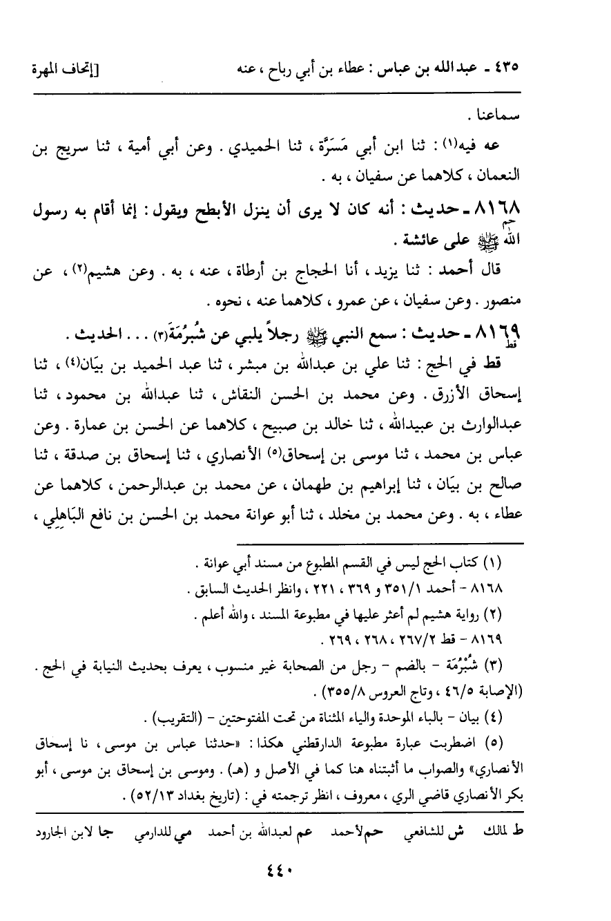 8169 - حَدِيثٌ (قط) : سَمِعَ النَّبِيُّ صَلَّى اللَّهُ عَلَيْهِ وَسَلَّمَ، رَجُلا يُلَبِّي عَنْ شُبْرُمَةَ ... الْحَدِيثَ. قط فِي الْحَجِّ: ثنا عَلِيُّ بْنُ عَبْدِ اللَّهِ بْنِ مُبَشِّرٍ، ثنا عَبْدُ الْحَمِيدِ بْنُ بَيَانٍ، ثنا إِسْحَاقُ الأَرْزَقُ. وَعَنْ مُحَمَّدِ بْنِ الْحَسَنِ النَّقَّاشِ، ثنا عَبْدُ اللَّهِ بْنُ مَحْمُودٍ، ثنا عَبْدُ الْوَارِثِ بْنُ عُبَيْدِ اللَّهِ، ثنا خَالِدُ بْنُ صُبَيْحٍ، كِلاهُمَا عَنِ الْحَسَنِ بْنِ عُمَارَةَ. وَعَنْ عَبَّاسِ بْنِ مُحَمَّدٍ، ثنا مُوسَى بْنُ إِسْحَاقَ الأَنْصَارِيُّ، ثنا إِسْحَاقُ بْنُ صَدَقَةَ، ثنا صَالِحُ بْنُ بَيَانٍ، ثنا إِبْرَاهِيمُ بْنُ طَهْمَانَ، عَنْ مُحَمَّدِ بْنِ عَبْدِ الرَّحْمَنِ، كِلاهُمَا عَنْ عَطَاءٍ، بِهِ. وَعَنْ مُحَمَّدِ بْنِ مَخْلَدٍ، ثنا أَبُو عَوَانَةَ مُحَمَّدُ بْنُ الْحَسَنِ بْنِ نَافِعٍ الْبَاهِلِيُّ،