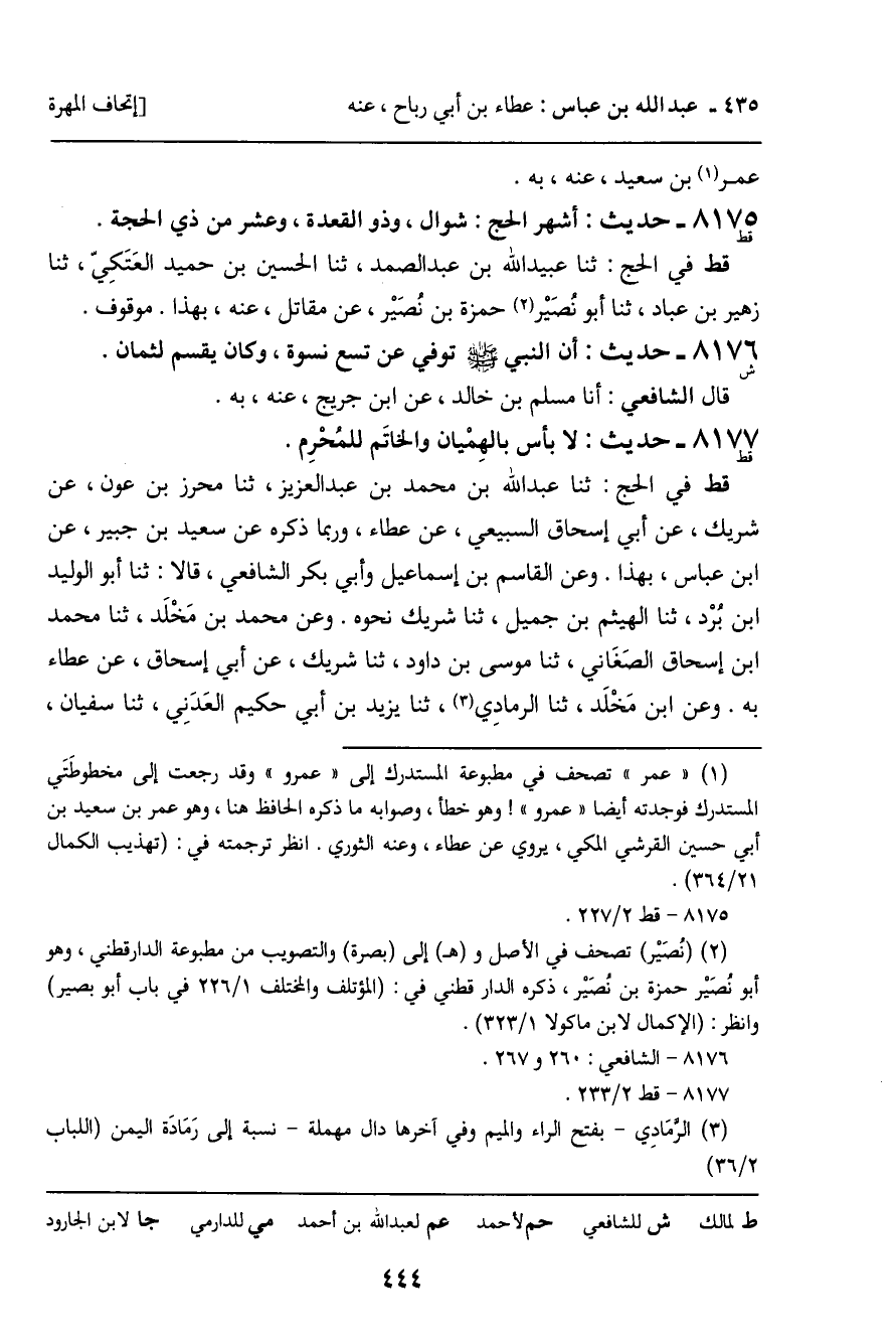 8177 - حَدِيثٌ (قط) : لا بَأْسَ بِالْهِمْيَانِ وَالْخَاتَمِ لِلْمُحْرِمِ. قط فِي الْحَجِّ: ثنا عَبْدُ اللَّهِ بْنُ مُحَمَّدِ بْنِ عَبْدِ الْعَزِيزِ، ثنا مُحْرِزُ بْنُ عَوْنٍ، عَنْ شَرِيكٍ، عَنْ أَبِي إِسْحَاقَ السَّبِيعِيِّ، عَنْ عَطَاءٍ، وَرُبَّمَا ذَكَرَهُ عَنْ سَعِيدِ بْنِ جُبَيْرٍ، عَنِ ابْنِ عَبَّاسٍ، بِهَذَا. وَعَنِ الْقَاسِمِ بْنِ إِسْمَاعِيلَ، وَأَبِي بَكْرٍ الشَّافِعِيِّ، قَالا: ثنا أَبُو الْوَلِيدِ بْنُ بُرْدٍ، ثنا الْهَيْثَمُ بْنُ جَمِيلٍ، ثنا شَرِيكٌ نَحْوَهُ. وَعَنْ مُحَمَّدِ بْنِ مَخْلَدٍ، ثنا مُحَمَّدُ بْنُ إِسْحَاقَ الصَّغَانِيُّ، ثنا مُوسَى بْنُ دَاوُدَ، ثنا شَرِيكٌ، عَنْ أَبِي إِسْحَاقَ، عَنْ عَطَاءٍ بِهِ. وَعَنِ ابْنِ مَخْلَدٍ، ثنا الرَّمَادِيُّ، ثنا يَزِيدُ بْنُ أَبِي حَكِيمٍ الْعَدنِيُّ، ثنا سُفْيَانُ،