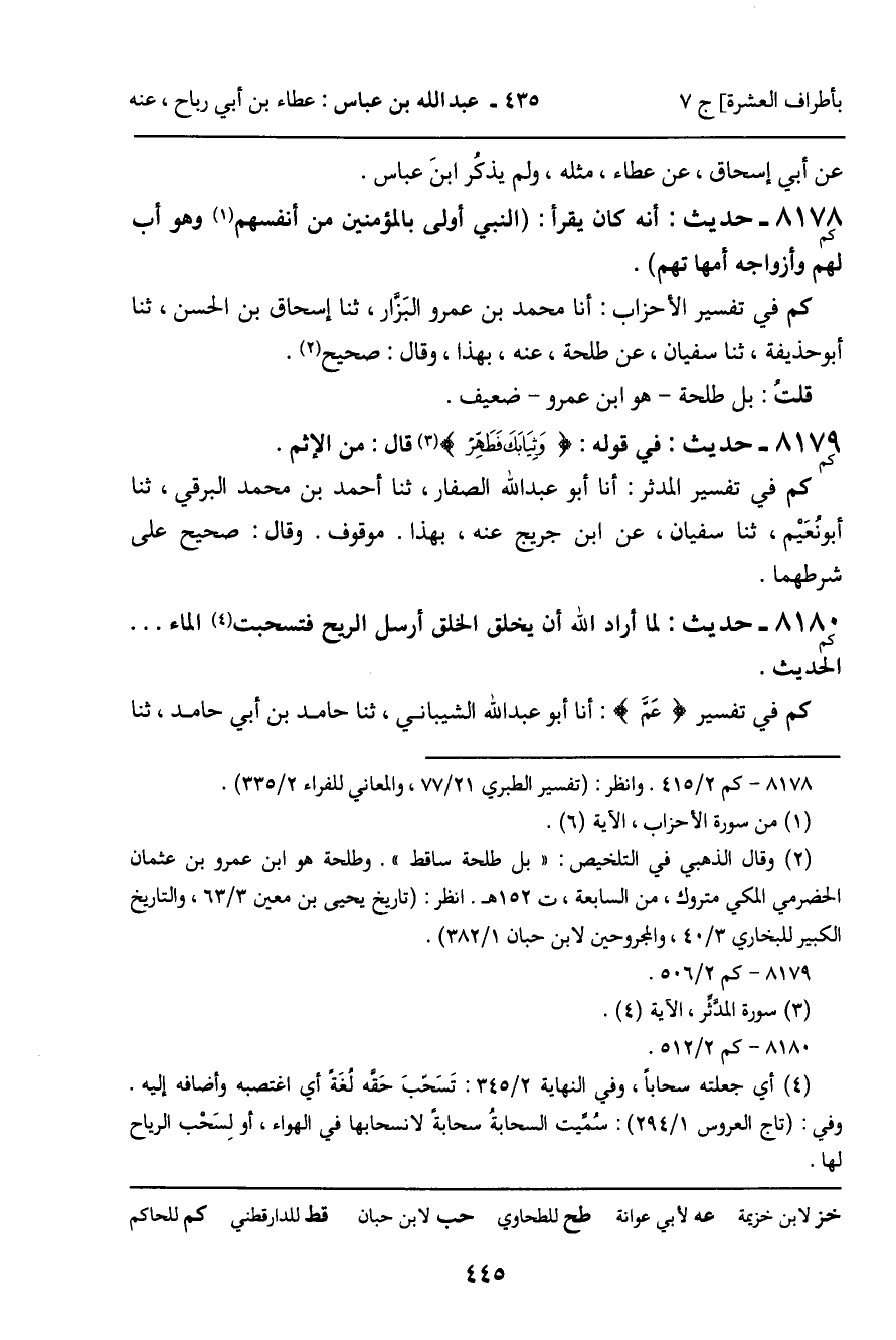 8179 - حَدِيثٌ (كم) : فِي قَوْلِهِ: وَثِيَابَكَ فَطَهِّرْ [سورة: المدثر، آية 4] قَالَ: مِنَ الإِثْمِ. كم فِي تَفْسِيرِ الْمُدَّثِّرِ: أنا أَبُو عَبْدِ اللَّهِ الصَّفَّارُ، ثنا أَحْمَدُ بْنُ مُحَمَّدٍ الْبَرْقِيُّ، ثنا أَبُو نُعَيْمٍ، ثنا سُفْيَانُ، عَنِ ابْنِ جُرَيْجٍ عَنْهُ، بِهَذَا. مَوْقُوفٌ. وَقَالَ: صَحِيحٌ عَلَى شَرْطِهِمَا.