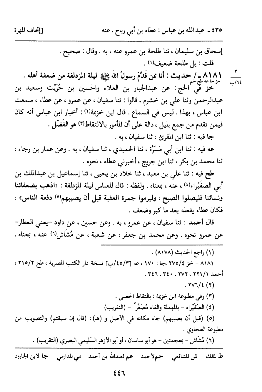جا فِيهِ: ثنا ابْنُ الْمُقْرِئِ، ثنا سُفْيَانُ، بِهِ. عه فِيهِ: ثنا ابْنُ أَبِي مَسَرَّةَ، ثنا الْحُمَيْدِيُّ، ثنا سُفْيَانُ، بِهِ. وَعَنْ عَمَّارِ بْنِ رَجَاءٍ، ثنا مُحَمَّدُ بْنُ بَكْرٍ، ثنا ابْنُ جُرَيْجٍ، أَخْبَرَنِي عَطَاءٌ، نَحْوَهُ. طح فِيهِ: ثنا عَلِيُّ بْنُ مَعْبَدٍ، ثنا خَلادُ بْنُ يَحْيَى، ثنا إِسْمَاعِيلُ بْنُ عَبْدِ الْمَلِكِ بْنِ أَبِي الصُّفَيْرَاءِ، عَنْهُ، بِمَعْنَاهُ. وَلَفْظُهُ: قَالَ لِلْعَبَّاسِ لَيْلَةَ الْمُزْدَلِفَةِ: " اذْهَبْ بِضُعَفَائِنَا وَنِسَائِنَا فَلْيُصَلُّوا الصُّبْحَ، وَلْيَرْمُوا جَمْرَةَ الْعَقَبَةِ قَبْلَ أَنْ يُصِيبَهُمْ دَفْعَةُ النَّاسِ "، فَكَانَ عَطَاءٌ يَفْعَلُهُ بَعْدَ مَا كَبِرَ وَضَعُفَ.