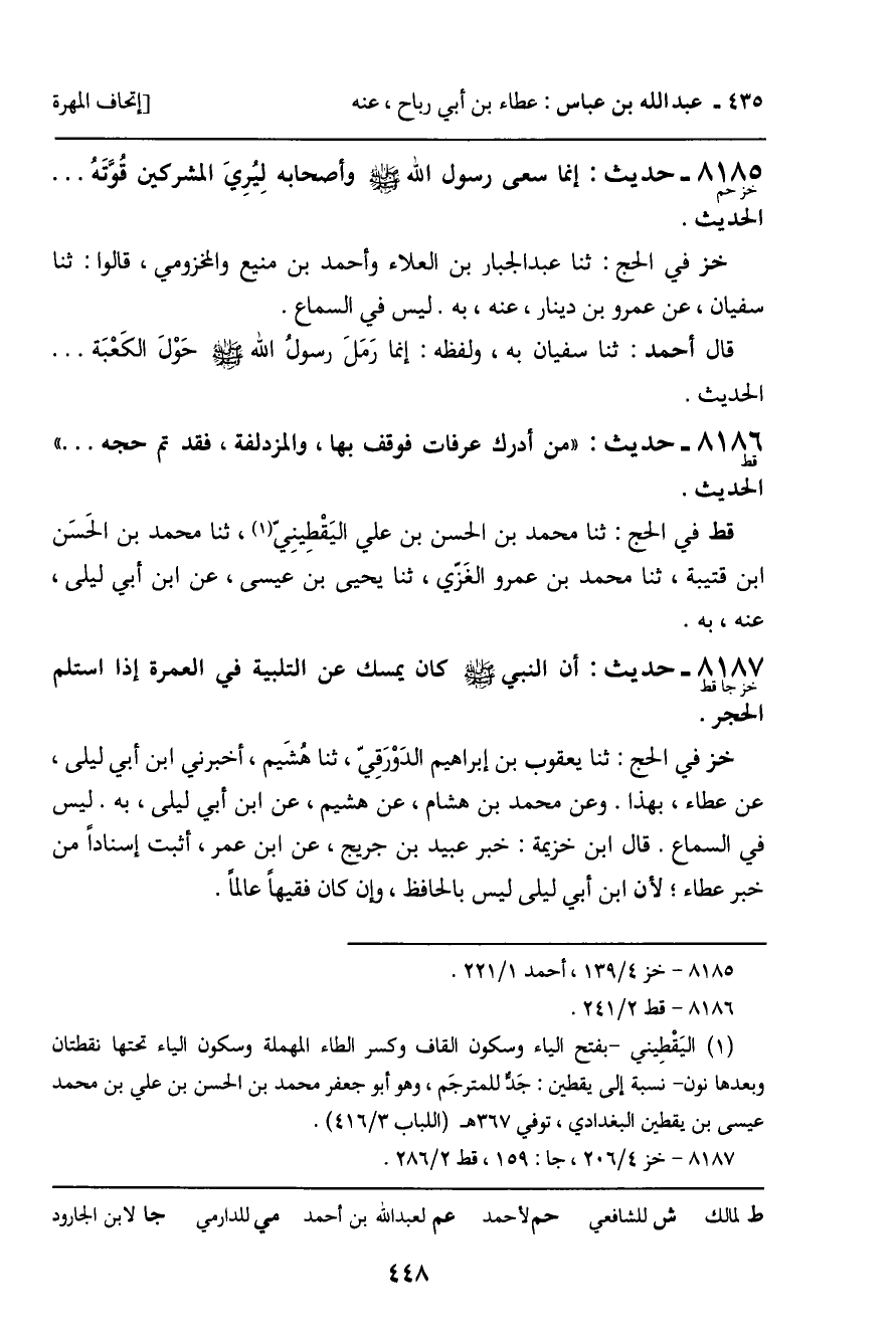 8186 - حَدِيثٌ (قط) : " مَنْ أَدْرَكَ عَرَفَاتٍ فَوَقَفَ بِهَا، وَالْمُزْدَلِفَةَ، فَقَدْ تَمَّ حَجُّهُ ... " الْحَدِيثَ. قط فِي الْحَجِّ: ثنا مُحَمَّدُ بْنُ الْحَسَنِ بْنِ عَلِيٍّ الْيَقْطِينِيُّ، ثنا مُحَمَّدُ بْنُ الْحَسَنِ بْنِ قُتَيْبَةَ، ثنا مُحَمَّدُ بْنُ عَمْرٍو الْغَزِّيُّ، ثنا يَحْيَى بْنُ عِيسَى، عَنِ ابْنِ أَبِي لَيْلَى، عَنْهُ، بِهِ.