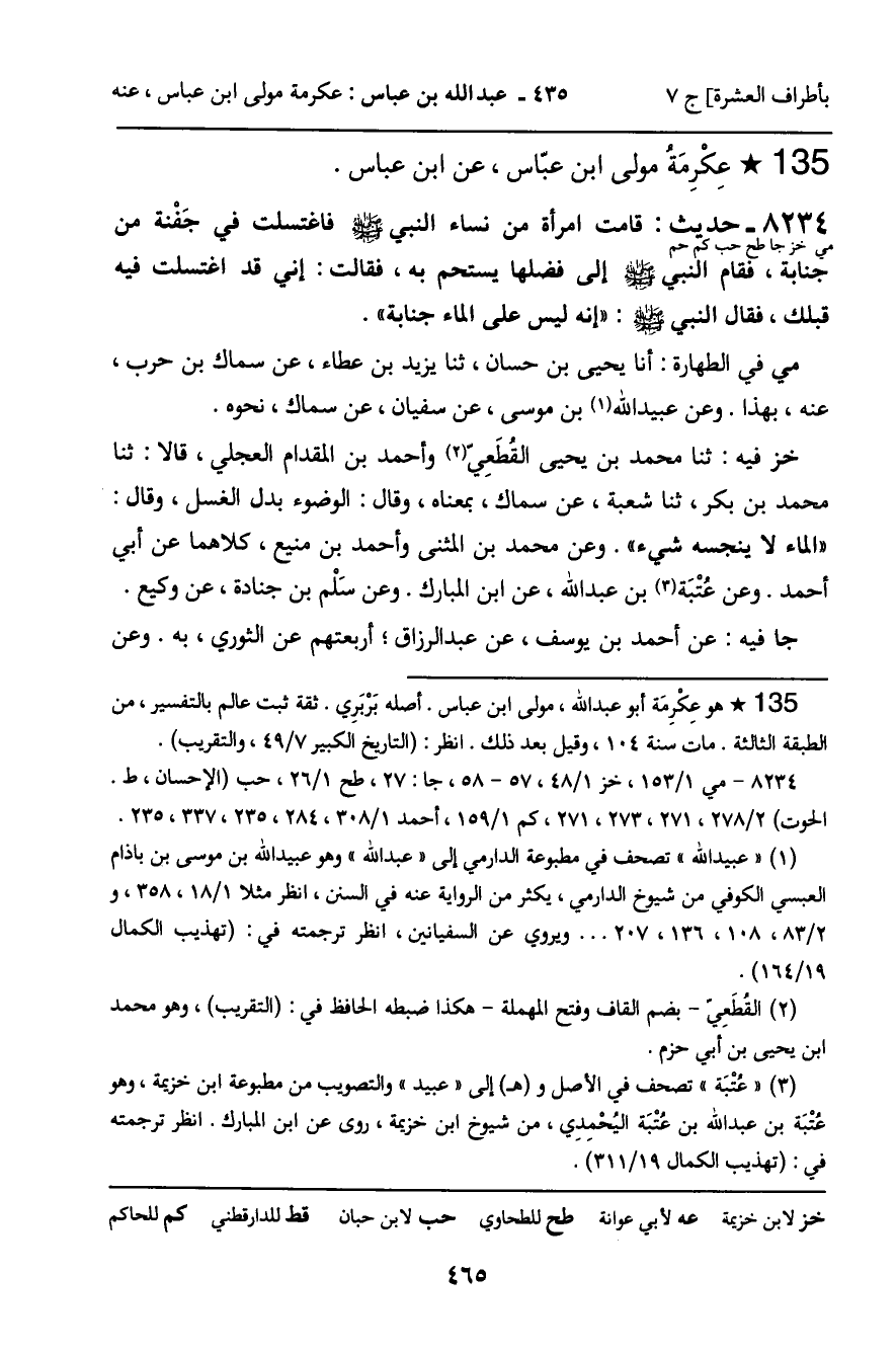 8234 - حَدِيثٌ (مي خز جا طح حب كم حم) : قَامَتِ امْرَأَةٌ مِنْ نِسَاءِ النَّبِيِّ صَلَّى اللَّهُ عَلَيْهِ وَسَلَّمَ، فَاغْتَسَلَتْ فِي جَفْنَةٍ مِنْ جَنَابَةٍ، فَقَامَ النَّبِيُّ صَلَّى اللَّهُ عَلَيْهِ وَسَلَّمَ، إِلَى فَضْلِهَا يَسْتَحِمُّ بِهِ، فَقَالَتْ: إِنِّي قَدِ اغْتَسَلْتُ فِيهِ قَبْلَكَ، فَقَالَ النَّبِيُّ صَلَّى اللَّهُ عَلَيْهِ وَسَلَّمَ: " إِنَّهُ لَيْسَ عَلَى الْمَاءِ جَنَابَةٌ ". مي فِي الطَّهَارَةِ: أنا يَحْيَى بْنُ حَسَّانٍ، ثنا يَزِيدُ بْنُ عَطَاءٍ، عَنْ سِمَاكِ بْنِ حَرْبٍ، عَنْهُ، بِهَذَا. وَعَنْ عُبَيْدِ اللَّهِ بْنِ مُوسَى، عَنْ سُفْيَانَ، عَنْ سِمَاكٍ، نَحْوَهُ. خز فِيهِ: ثنا مُحَمَّدُ بْنُ يَحْيَى الْقُطَعِيُّ، وَأَحْمَدُ بْنُ الْمِقْدَامِ الْعِجْلِيُّ، قَالا: ثنا مُحَمَّدُ بْنُ بَكْرٍ، ثنا شُعْبَةُ، عَنْ سِمَاكٍ، بِمَعْنَاهُ، وَقَالَ: الْوُضُوءُ بَدَلُ الْغُسْلِ، وَقَالَ: " الْمَاءُ لا يُنَجِّسُهُ شَيْءٌ ". وَعَنْ مُحَمَّدِ بْنِ الْمُثَنَّى، وَأَحْمَدَ بْنِ مَنِيعٍ، كِلاهُمَا عَنْ أَبِي أَحْمَدَ. وَعَنْ عُتْبَةَ بْنِ عَبْدِ اللَّهِ، عَنِ ابْنِ الْمُبَارَكِ. وَعَنْ سَلْمِ بْنِ جُنَادَةَ، عَنْ وَكِيعٍ. جا فِيهِ: عَنْ أَحْمَدَ بْنِ يُوسُفَ، عَنِ عَبْدِ الرَّزَّاقِ، أَرْبَعَتُهُمْ عَنِ الثَّوْرِيِّ، بِهِ. وَعَنْ