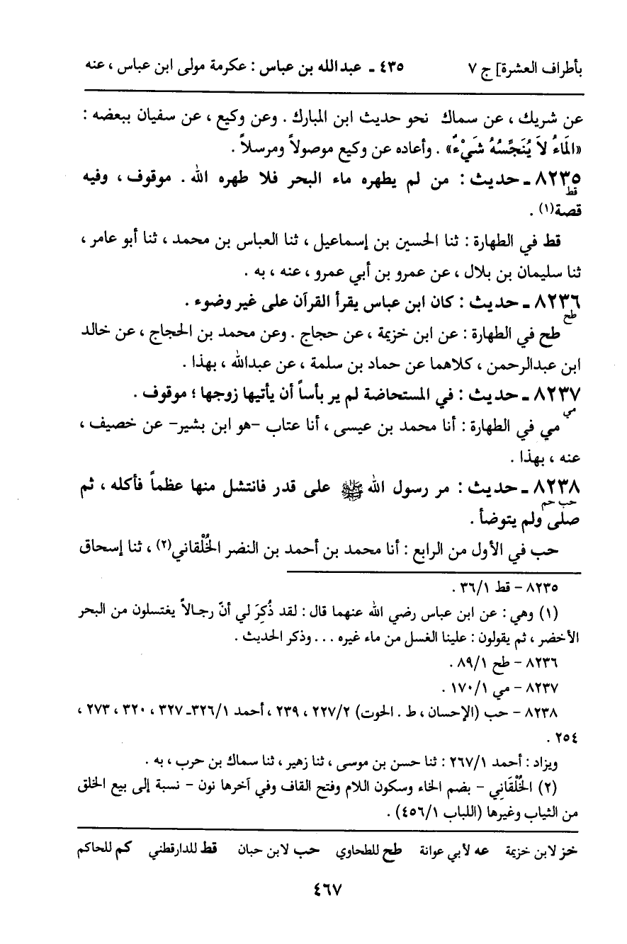 8236 - حَدِيثٌ (طح) : كَانَ ابْنُ عَبَّاسٍ يَقْرَأُ الْقُرْآنَ عَلَى غَيْرِ وُضُوءٍ. طح فِي الطَّهَارَةِ: عَنِ ابْنِ خُزَيْمَةَ، عَنْ حَجَّاجٍ. وَعَنْ مُحَمَّدِ بْنِ الْحَجَّاجِ، عَنْ خَالِدِ بْنِ عَبْدِ الرَّحْمَنِ، كِلاهُمَا عَنْ حَمَّادِ بْنِ سَلَمَةَ، عَنْ عَبْدِ اللَّهِ، بِهَذَا.