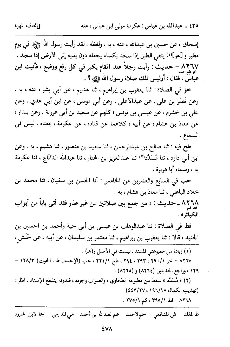 8267 - حَدِيثٌ (خز طح حب) : رَأَيْتُ رَجُلا عِنْدَ الْمَقَامِ يُكَبِّرُ فِي كُلِّ رَفْعٍ وَوَضْعٍ، فَأَتَيْتُ ابْنَ عَبَّاسٍ، فَقَالَ: أَوَلَيْسَ تِلْكَ صَلاةُ رَسُولِ اللَّهِ صَلَّى اللَّهُ عَلَيْهِ وَسَلَّمَ؟ . خز فِي الصَّلاةِ: ثنا يَعْقُوبُ بْنُ إِبْرَاهِيمَ، ثنا هُشَيْمٌ، عَنْ أَبِي بِشْرٍ، عَنْهُ، بِهِ. وَعَنْ نَصْرِ بْنِ عَلِيٍّ، عَنْ عَبْدِ الأَعْلَى. وَعَنْ أَبِي مُوسَى، عَنِ ابْنِ أَبِي عَدِيٍّ. وَعَنْ عَلِيِّ بِنْ خَشْرَمٍ، عَنْ عِيسَى بْنِ يُونُسَ: كُلُّهُمْ عَنْ سَعِيدِ بْنِ أَبِي عَرُوبَةَ. وَعَنْ بُنْدَارٍ، عَنْ مُعَاذِ بْنِ هِشَامٍ، عَنْ أَبِيهِ، كِلاهُمَا عَنْ قَتَادَةَ، عَنْ عِكْرِمَةَ، بِمَعْنَاهُ. لَيْسَ فِي السَّمَاعِ. طح فِيهِ: ثنا صَالِحُ بْنُ عَبْدِ الرَّحْمَنِ، ثنا سَعِيدُ بْنُ مَنْصُورٍ، ثنا هُشَيْمٌ، بِهِ. وَعَنِ ابْنِ أَبِي دَاوُدَ، ثنا مُسَدَّدٌ، ثنا عَبْدُ الْعَزِيزِ بْنُ الْمُخْتَارِ، ثنا عَبْدُ اللَّهِ الدَّانَاجِ، ثنا عِكْرِمَةُ، بِهِ. وَسَمَّاهُ أَبَا هُرَيْرَةَ. حب فِي السَّابِعِ وَالْعِشْرِينَ مِنَ الْخَامِسِ: أنا الْحَسَنُ بْنُ سُفْيَانَ، ثنا مُحَمَّدُ بْنُ خَلادٍ الْبَاهِلِيُّ، ثنا مُعَاذُ بْنُ هِشَامٍ، بِهِ.