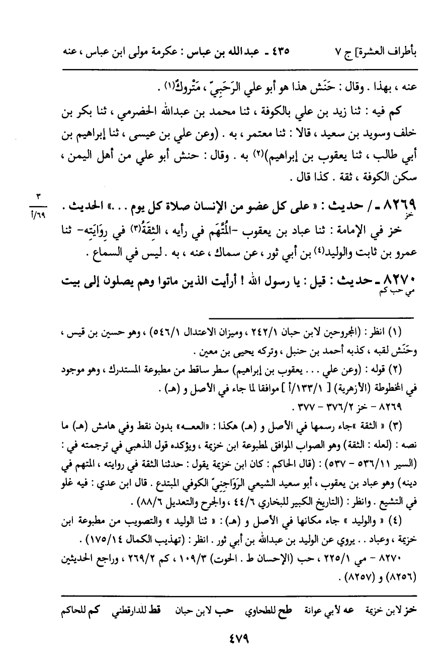 8269 - حَدِيثٌ (خز) : " عَلَى كُلِّ عُضْوٍ مِنَ الإِنْسَانِ صَلاةٌ كُلَّ يَوْمٍ ... " الْحَدِيثَ. خز فِي الإِمَامَةِ: ثنا عَبَّادُ بْنُ يَعْقُوبَ، الْمُتَّهَمُ فِي رَأْيِهِ، الثِّقَةُ فِي رِوَايَتِهِ، ثنا عَمْرُو بْنُ ثَابِتٍ وَالْوَلِيدُ بْنُ أَبِي ثَوْرٍ، عَنْ سِمَاكٍ، عَنْهُ، بِهِ. لَيْسَ فِي السَّمَاعِ.