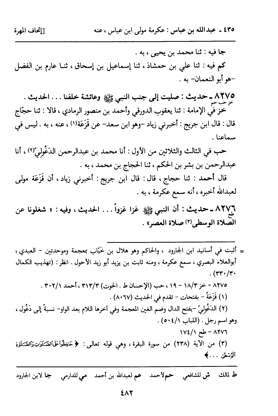 8275 - حَدِيثٌ (خز حب حم) : صَلَّيْتُ إِلَى جَنْبِ النَّبِيِّ صَلَّى اللَّهُ عَلَيْهِ وَسَلَّمَ، وَعَائِشَةُ خَلْفَنَا ... الْحَدِيثَ. خز فِي الإِمَامَةِ: ثنا يَعْقُوبُ الدَّوْرَقِيُّ وَأَحْمَدُ بْنُ مَنْصُورٍ الرَّمَادِيُّ، قَالا: ثنا حَجَّاجٌ قَالَ: قَالَ ابْنُ جُرَيْجٍ: أَخْبَرَنِي زِيَادٌ، وَهُوَ ابْنُ سَعْدٍ، عَنْ قَزَعَةَ، عَنْهُ، بِهِ. لَيْسَ فِي سَمَاعِنَا.