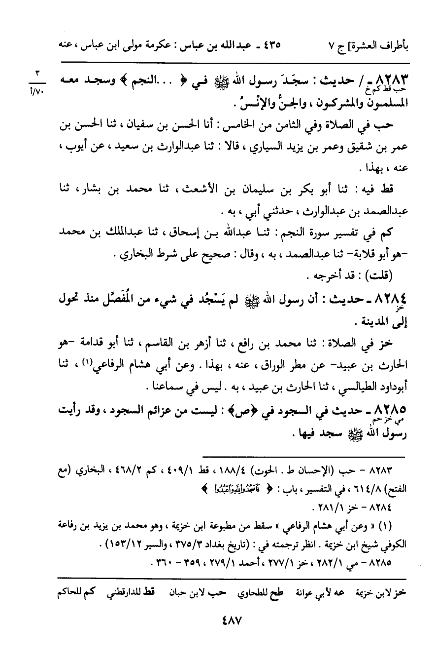 8283 - حَدِيثٌ (حب قط كم خ) : سَجَدَ رَسُولُ اللَّهِ صَلَّى اللَّهُ عَلَيْهِ وَسَلَّمَ، فِي النَّجْمُ [سورة: الطارق، آية 3] وَسَجَدَ مَعَهُ الْمُسْلِمُونَ وَالْمُشْرِكُونَ، وَالْجِنُّ وَالإِنْسُ. حب فِي الصَّلاةِ وَفِي الثَّامِنِ مِنَ الْخَامِسِ: أنا الْحَسَنُ بْنُ سُفْيَانَ، ثنا الْحَسَنُ بْنُ عُمَرَ بْنِ شَقِيقٍ وَعُمَرُ بْنُ يَزِيدَ السَّيَّارِيُّ، قَالا: ثنا عَبْدُ الْوَارِثِ بْنُ سَعِيدٍ، عَنْ أَيُّوبَ، عَنْهُ، بِهَذَا. قط فِيهِ: ثنا أَبُو بَكْرِ بْنُ سُلَيْمَانَ بْنِ الأَشْعَثِ، ثنا مُحَمَّدُ بْنُ بَشَّارٍ، ثنا عَبْدُ الصَّمَدِ بْنُ عَبْدِ الْوَارِثِ، حَدَّثَنِي أَبِي، بِهِ. كم فِي تَفْسِيرِ سُورَةِ النَّجْمِ: ثنا عَبْدُ اللَّهِ بْنُ إِسْحَاقَ، ثنا عَبْدُ الْمَلِكِ بْنُ مُحَمَّدٍ هُوَ أَبُو قِلابَةَ، ثنا عَبْدُ الصَّمَدِ، بِهِ، وَقَالَ: صَحِيحٌ عَلَى شَرْطِ الْبُخَارِيِّ , قُلْتُ: قَدْ أَخْرَجَهُ.