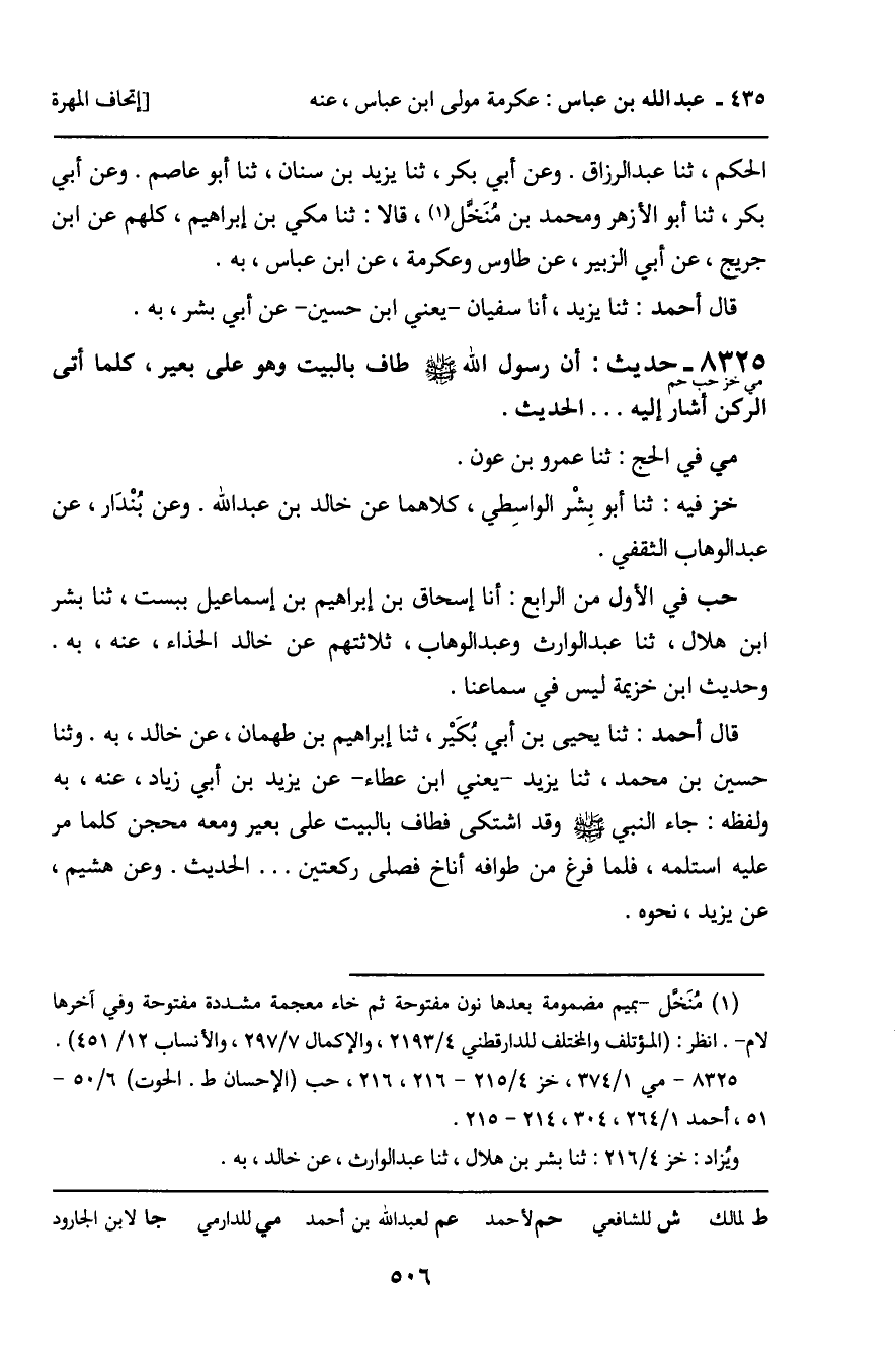 8325 - حَدِيثٌ (مي خز حب حم) : أَنَّ رَسُولَ اللَّهِ صَلَّى اللَّهُ عَلَيْهِ وَسَلَّمَ، طَافَ بِالْبَيْتِ وَهُوَ عَلَى بَعِيرٍ، كُلَّمَا أَتَى الرُّكْنَ أَشَارَ إِلَيْهِ ... الْحَدِيثَ. مي فِي الْحَجِّ: ثنا عَمْرُو بْنُ عَوْنٍ. خز فِيهِ: ثنا أَبُو بِشْرٍ الْوَاسِطِيُّ، كِلاهُمَا عَنْ خَالِدِ بْنِ عَبْدِ اللَّهِ. وَعَنْ بُنْدَارٍ، عَنْ عَبْدِ الْوَهَّابِ الثَّقَفِيِّ. حب فِي الأَوَّلِ مِنَ الرَّابِعِ: أنا إِسْحَاقُ بْنُ إِبْرَاهِيمَ بْنِ إِسْمَاعِيلَ بِبُسْتَ، ثنا بِشْرُ بْنُ هِلالٍ، ثنا عَبْدُ الْوَارِثِ، وَعَبْدُ الْوَهَّابِ، ثَلاثَتُهُمْ عَنْ خَالِدٍ الْحَذَّاءِ، عَنْهُ، بِهِ. وَحَدِيثُ ابْنِ خُزَيْمَةَ لَيْسَ فِي سَمَاعِنَا. قَالَ أَحْمَدُ: ثنا يَحْيَى بْنُ أَبِي بُكَيْرٍ، ثنا إِبْرَاهِيمُ بْنُ طَهْمَانَ، عَنْ خَالِدٍ، بِهِ. وَثنا حُسَيْنُ بْنُ مُحَمَّدٍ، ثنا يَزِيدُ، يَعْنِي ابْنَ عَطَاءٍ، عَنْ يَزِيدَ بْنِ أَبِي زِيَادٍ، عَنْهُ، بِهِ. وَلَفْظُهُ: جَاءَ النَّبِيُّ صَلَّى اللَّهُ عَلَيْهِ وَسَلَّمَ وَقَدِ اشْتَكَى فَطَافَ بِالْبَيْتِ عَلَى بَعِيرٍ وَمَعَهُ مِحْجَنٌ كُلَّمَا مَرَّ عَلَيْهِ اسْتَلَمَهُ، فَلَمَّا فَرَغَ مِنْ طَوَافِهِ أَنَاخَ فَصَلَّى رَكْعَتَيْنِ ... الْحَدِيثَ. وَعَنْ هُشَيْمٍ، عَنْ يَزِيدَ، نَحْوَهُ.