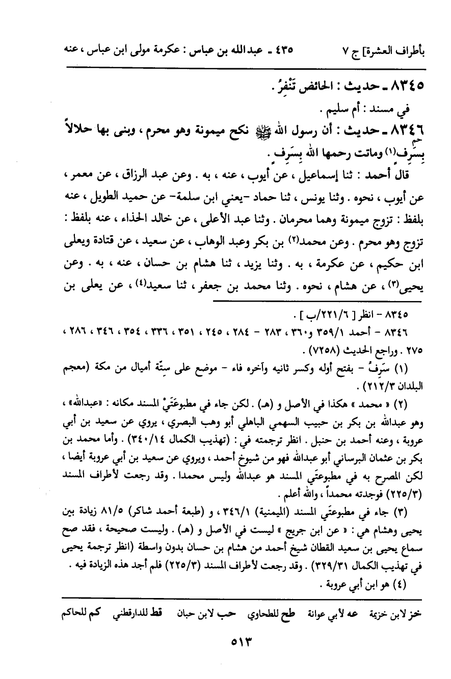 8346 - حَدِيثٌ (حم) : أَنَّ رَسُولَ اللَّهِ صَلَّى اللَّهُ عَلَيْهِ وَسَلَّمَ نَكَحَ مَيْمُونَةَ وَهُوَ مُحْرِمٌ، وَبَنَى بِهَا حَلالا بِسَرِفَ وَمَاتَتْ رَحِمَهَا اللَّهُ بِسَرِفَ. قَالَ أَحْمَدُ: ثنا إِسْمَاعِيلُ، عَنْ أَيُّوبَ، عَنْهُ، بِهِ. وَعَنْ عَبْدِ الرَّزَّاقِ، عَنْ مَعْمَرٍ، عَنْ أَيُّوبَ، نَحْوَهُ. وثنا يُونُسُ، ثنا حَمَّادٌ، يَعْنِي ابْنَ سَلَمَةَ، عَنْ حُمَيْدٍ الطَّوِيلِ، عَنْهُ بِلَفْظِ: تَزَوَّجَ مَيْمُونَةَ وَهُمَا مُحْرِمَانِ. وثنا عَبْدُ الأَعْلَى، عَنْ خَالِدٍ الْحَذَّاءِ، عَنْهُ بِلَفْظِ: تَزَوَّجَ وَهُوَ مُحْرِمٌ. وَعَنْ مُحَمَّدِ بْنِ بَكْرٍ، وَعَبْدِ الْوَهَّابِ، عَنْ سَعِيدٍ، عَنْ قَتَادَةَ، وَيَعْلَى بْنِ حَكِيمٍ، عَنْ عِكْرِمَةَ، بِهِ. وَثنا يَزِيدُ، ثنا هِشَامُ بْنُ حَسَّانٍ، عَنْهُ، بِهِ. وَعَنْ يَحْيَى، عَنْ هِشَامٍ، نَحْوَهُ، وثنا مُحَمَّدُ بْنُ جَعْفَرٍ، ثنا سَعِيدٌ، عَنْ يَعْلَى بْنِ