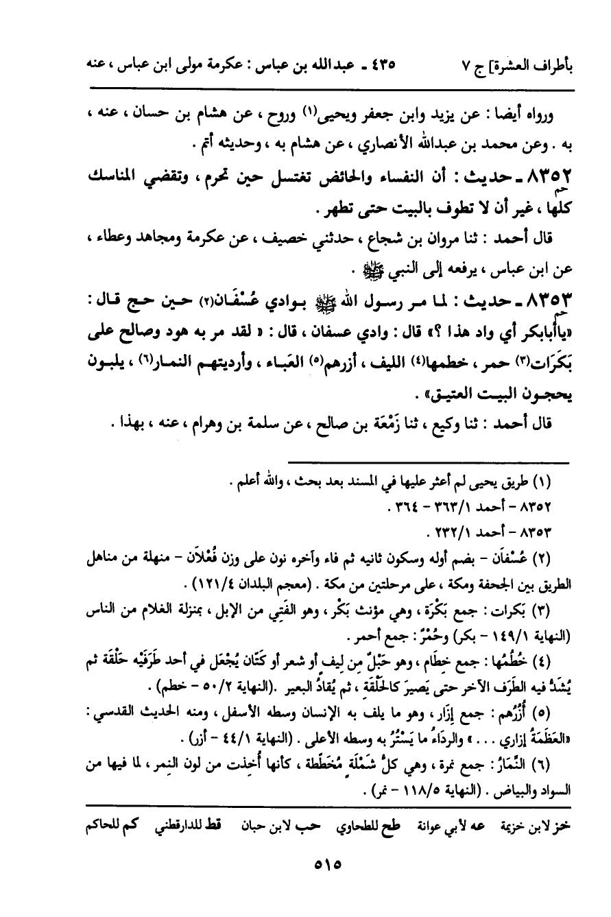 8353 - حَدِيثٌ (حم) : لَمَّا مَرَّ رَسُولُ اللَّهِ صَلَّى اللَّهُ عَلَيْهِ وَسَلَّمَ بِوَادِي عُسْفَانَ حِينَ حَجَّ , قَالَ: " يَا أَبَا بَكْرٍ أَيُّ وَادٍ هَذَا؟ " , قَالَ: وَادِي عُسْفَانَ، قَالَ: " لَقَدْ مَرَّ بِهِ هُودٌ وَصَالِحٌ عَلَى بَكَرَاتٍ حُمْرٍ، خُطُمُهَا اللِّيفُ، أُزُرُهُمُ الْعَبَاءُ، وَأَرْدِيَتُهُمُ النِّمَارُ، يُلَبُّونَ يَحُجُّونَ الْبَيْتَ الْعَتِيقَ ". قَالَ أَحْمَدُ: ثنا وَكِيعٌ، ثنا زَمْعَةُ بْنُ صَالِحٍ، عَنْ سَلَمَةَ بْنِ وَهْرَامَ، عَنْهُ، بِهَذَا.