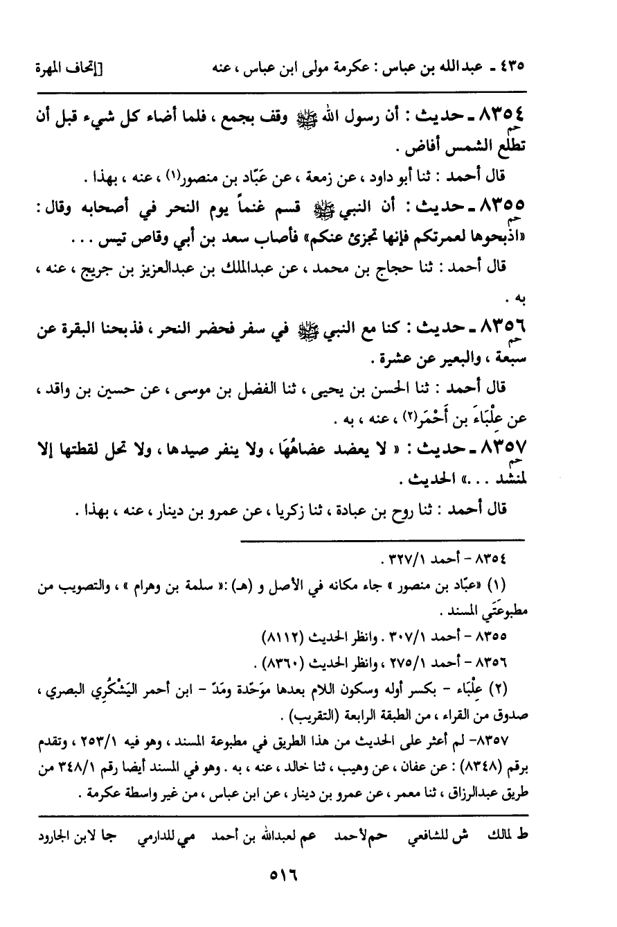 8356 - حَدِيثٌ (حم) : كُنَّا مَعَ النَّبِيِّ صَلَّى اللَّهُ عَلَيْهِ وَسَلَّمَ فِي سَفَرٍ فَحَضَرَ النَّحْرَ، فَذَبَحْنَا الْبَقَرَةَ عَنْ سَبْعَةٍ، وَالْبَعِيرَ عَنْ عَشْرَةٍ. قَالَ أَحْمَدُ: ثنا الْحَسَنُ بْنُ يَحْيَى، ثنا الْفَضْلُ بْنُ مُوسَى، عَنْ حُسَيْنِ بْنِ وَاقِدٍ، عَنْ عِلْبَاءَ بْنِ أَحْمَرَ، عَنْهُ، بِهِ.