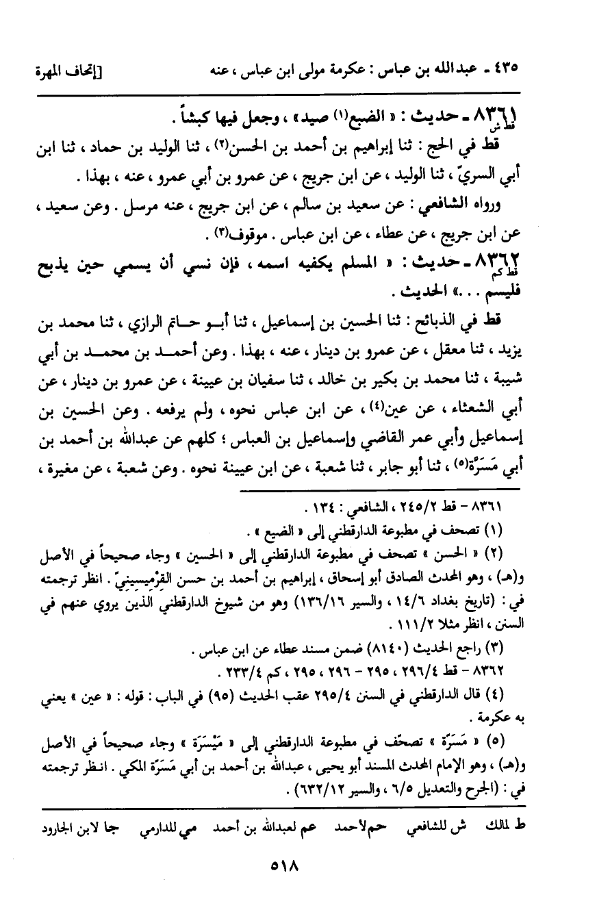 8362 - حَدِيثٌ (قط كم) : " الْمُسْلِمُ يَكْفِيهِ اسْمُهُ، فَإِنْ نَسِيَ أَنْ يُسَمِّيَ حِينِ يَذْبَحُ فَلْيُسَمِّ ... " الْحَدِيثَ. قط فِي الذَّبَائِحِ: ثنا الْحُسَيْنُ بْنُ إِسْمَاعِيلَ، ثنا أَبُو حَاتِمٍ الرَّازِيُّ، ثنا مُحَمَّدُ بْنُ يَزِيدَ، ثنا مَعْقِلٌ، عَنْ عَمْرِو بْنِ دِينَارٍ، عَنْهُ، بِهَذَا. وَعَنْ أَحْمَدَ بْنِ مُحَمَّدِ بْنِ أَبِي شَيْبَةَ، ثنا مُحَمَّدُ بْنُ بُكَيْرِ بْنِ خَالِدٍ، ثنا سُفْيَانُ بْنُ عُيَيْنَةَ، عَنْ عَمْرِو بْنِ دِينَارٍ، عَنْ أَبِي الشَّعْثَاءِ، عَنْ عَيْنٍ، عَنِ ابْنِ عَبَّاسٍ نَحْوَهُ، وَلَمْ يَرْفَعْهُ. وَعَنِ الْحُسَيْنِ بْنِ إِسْمَاعِيلَ، وَأَبِي عُمَرَ الْقَاضِي، وَإِسْمَاعِيلَ بْنِ الْعَبَّاسِ؛ كُلُّهُمْ عَنْ عَبْدِ اللَّهِ بْنِ أَحْمَدَ بْنِ أَبِي مَسَرَّةَ، ثَنا أَبُو جَابِرٍ، ثنا شُعْبَةُ، عَنِ ابْنِ عُيَيْنَةَ نَحْوَهُ. وَعَنْ شُعْبَةَ، عَنْ مُغِيرَةَ،