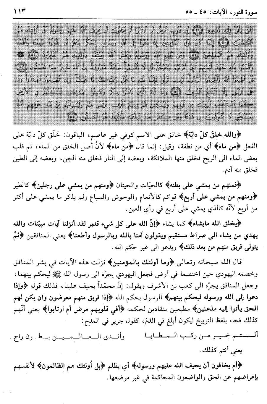 وَاللَّهُ خَلَقَ كُلَّ دَابَّةٍ مِنْ ماءٍ فَمِنْهُمْ مَنْ يَمْشِي عَلى بَطْنِهِ وَمِنْهُمْ مَنْ يَمْشِي عَلى رِجْلَيْنِ وَمِنْهُمْ مَنْ يَمْشِي عَلى أَرْبَعٍ يَخْلُقُ اللَّهُ ما يَشاءُ إِنَّ اللَّهَ عَلى كُلِّ شَيْءٍ قَدِيرٌ (45) لَقَدْ أَنْزَلْنا آياتٍ مُبَيِّناتٍ وَاللَّهُ يَهْدِي مَنْ يَشاءُ إِلى صِراطٍ مُسْتَقِيمٍ (46) وَيَقُولُونَ آمَنَّا بِاللَّهِ وَبِالرَّسُولِ وَأَطَعْنا ثُمَّ يَتَوَلَّى فَرِيقٌ مِنْهُمْ مِنْ بَعْدِ ذلِكَ وَما أُولئِكَ بِالْمُؤْمِنِينَ (47) وَإِذا دُعُوا إِلَى اللَّهِ وَرَسُولِهِ لِيَحْكُمَ بَيْنَهُمْ إِذا فَرِيقٌ مِنْهُمْ مُعْرِضُونَ (48) وَإِنْ يَكُنْ لَهُمُ الْحَقُّ يَأْتُوا إِلَيْهِ مُذْعِنِينَ (49)