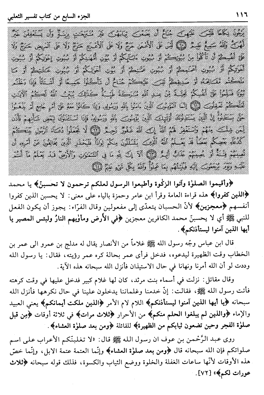 وَأَقِيمُوا الصَّلاةَ وَآتُوا الزَّكاةَ وَأَطِيعُوا الرَّسُولَ لَعَلَّكُمْ تُرْحَمُونَ لا تَحْسَبَنَّ يا محمد الَّذِينَ كَفَرُوا هذه قراءة العامة وقرأ ابن عامر وحمزة بالياء على معنى: لا يحسبن الذين كفروا أنفسهم مُعْجِزِينَ لأنّ الحسبان يتعدّى إلى مفعولين وقال الفرّاء: يجوز أن يكون الفعل للنبي صلى الله عليه وسلّم أي لا يحسبنّ محمد الكافرين مُعْجِزِينَ فِي الْأَرْضِ وَمَأْواهُمُ النَّارُ وَلَبِئْسَ الْمَصِيرُ يا أَيُّهَا الَّذِينَ آمَنُوا لِيَسْتَأْذِنْكُمُ.