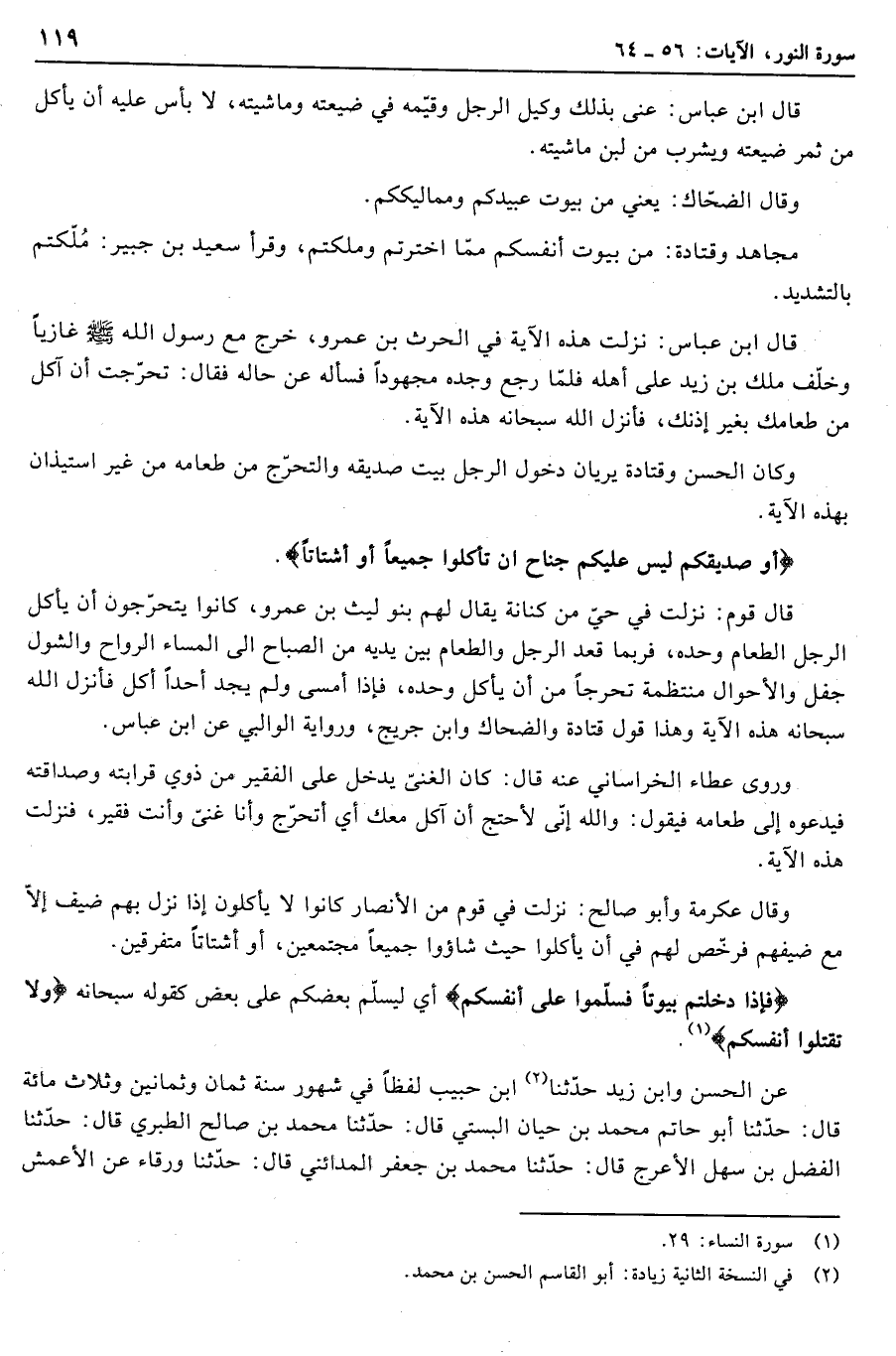 قال قوم: نزلت في حيّ من كنانة يقال لهم بنو ليث بن عمرو، كانوا يتحرّجون أن يأكل الرجل الطعام وحده، فربما قعد الرجل والطعام بين يديه من الصباح الى المساء الرواح والشول جفل والأحوال منتظمة تحرجا من أن يأكل وحده، فإذا أمسى ولم يجد أحدا أكل فأنزل الله سبحانه هذه الآية وهذا قول قتادة والضحاك وابن جريج، ورواية الوالبي عن ابن عباس.