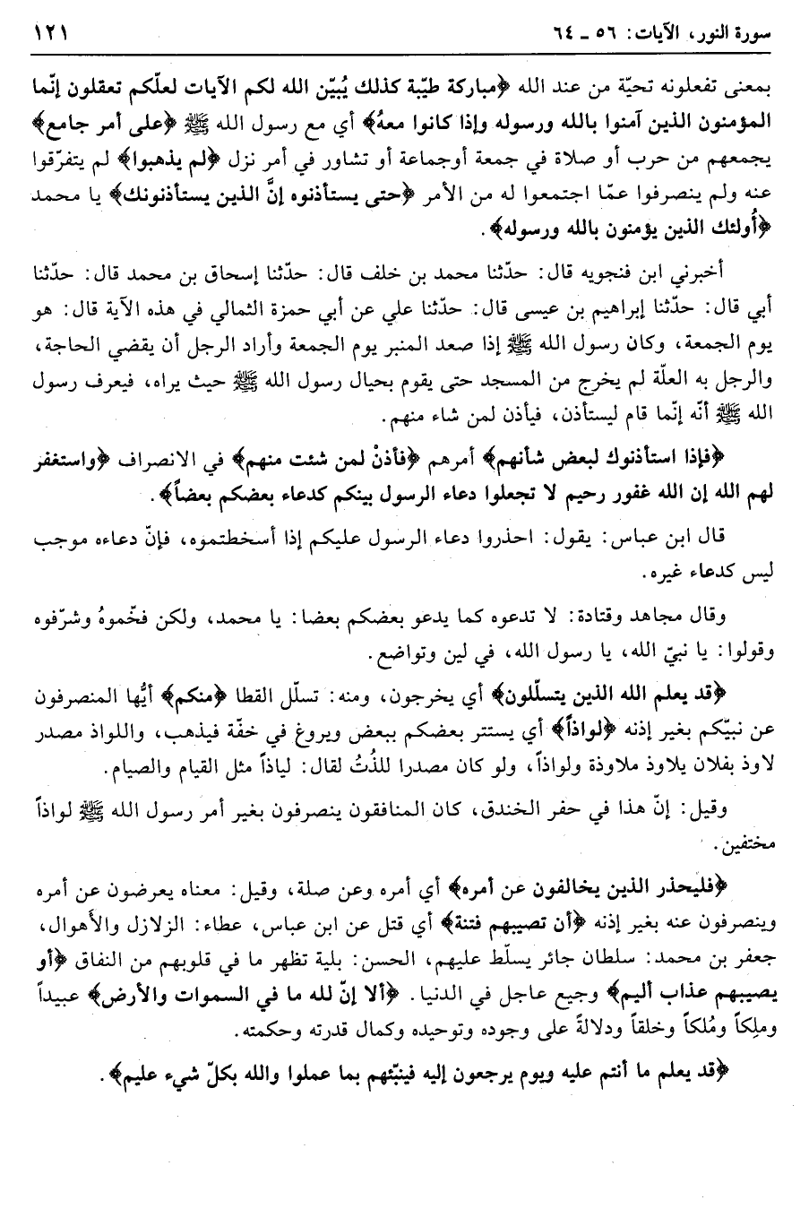 بمعنى تفعلونه تحيّة من عند الله مُبارَكَةً طَيِّبَةً كَذلِكَ يُبَيِّنُ اللَّهُ لَكُمُ الْآياتِ لَعَلَّكُمْ تَعْقِلُونَ إِنَّمَا الْمُؤْمِنُونَ الَّذِينَ آمَنُوا بِاللَّهِ وَرَسُولِهِ وَإِذا كانُوا مَعَهُ أي مع رسول الله صلى الله عليه وسلّم عَلى أَمْرٍ جامِعٍ يجمعهم من حرب أو صلاة في جمعة أو جماعة أو تشاور في أمر نزل لَمْ يَذْهَبُوا لم يتفرّقوا عنه ولم ينصرفوا عمّا اجتمعوا له من الأمر حَتَّى يَسْتَأْذِنُوهُ إِنَّ الَّذِينَ يَسْتَأْذِنُونَكَ يا محمد أُولئِكَ الَّذِينَ يُؤْمِنُونَ بِاللَّهِ وَرَسُولِهِ.