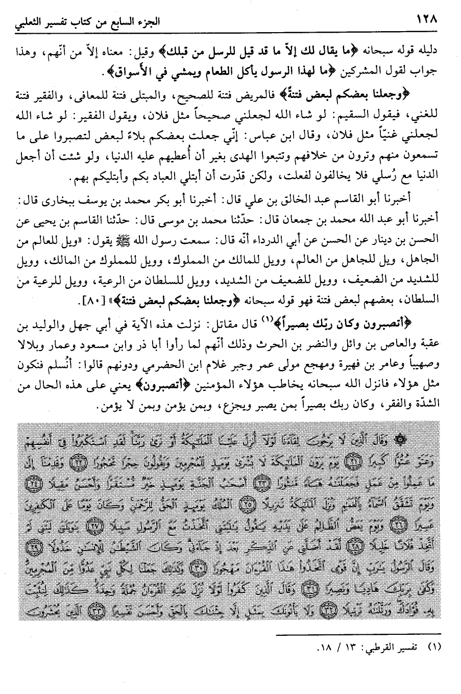 وَجَعَلْنا بَعْضَكُمْ لِبَعْضٍ فِتْنَةً فالمريض فتنة للصحيح، والمبتلى فتنة للمعافى، والفقير فتنة للغني، فيقول السقيم: لو شاء الله لجعلني صحيحا مثل فلان، ويقول الفقير: لو شاء الله لجعلني غنيّا مثل فلان، وقال ابن عباس: إنّي جعلت بعضكم بلاء لبعض لتصبروا على ما تسمعون منهم وترون من خلافهم وتتبعوا الهدى بغير أن أعطيهم عليه الدنيا، ولو شئت أن أجعل الدنيا مع رسلي فلا يخالفون لفعلت، ولكن قدّرت أن أبتلي العباد بكم وأبتليكم بهم.