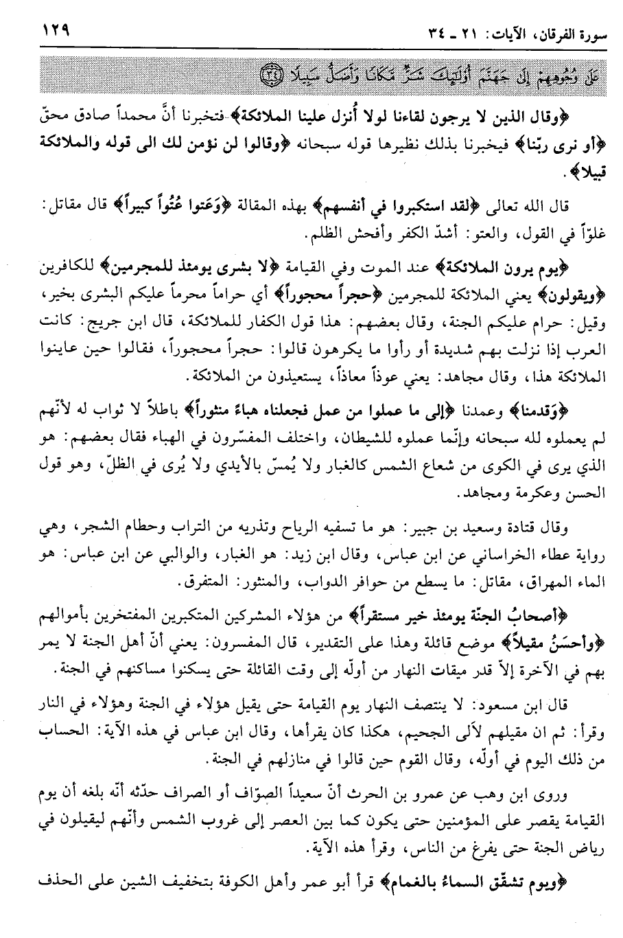 وَقَدِمْنا وعمدنا إِلى ما عَمِلُوا مِنْ عَمَلٍ فَجَعَلْناهُ هَباءً مَنْثُوراً باطلا لا ثواب له لأنّهم لم يعملوه لله سبحانه وإنّما عملوه للشيطان، واختلف المفسّرون في الهباء فقال بعضهم: هو الذي يرى في الكوى من شعاع الشمس كالغبار ولا يمسّ بالأيدي ولا يرى في الظلّ، وهو قول الحسن وعكرمة ومجاهد.