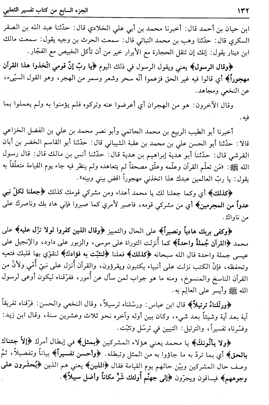 وَكَفى بِرَبِّكَ هادِياً وَنَصِيراً على الحال والتمييز وَقالَ الَّذِينَ كَفَرُوا لَوْلا نُزِّلَ عَلَيْهِ على محمد الْقُرْآنُ جُمْلَةً واحِدَةً كما أنزلت التوراة على موسى، والزبور على داود، والإنجيل على عيسى جملة واحدة قال الله سبحانه كَذلِكَ فعلنا لِنُثَبِّتَ بِهِ فُؤادَكَ لنقوّي بها قلبك فتعيه وتحفظه، فإنّ الكتب نزلت على أنبياء يكتبون ويقرءون، والقرآن أنزل على نبيّ أمّي ولأنّ من القرآن الناسخ والمنسوخ، ومنه ما هو جواب لمن سأل عن أمور، ففرّقناه ليكون أوعى لرسول الله صلى الله عليه وسلّم وأيسر على العالم به.